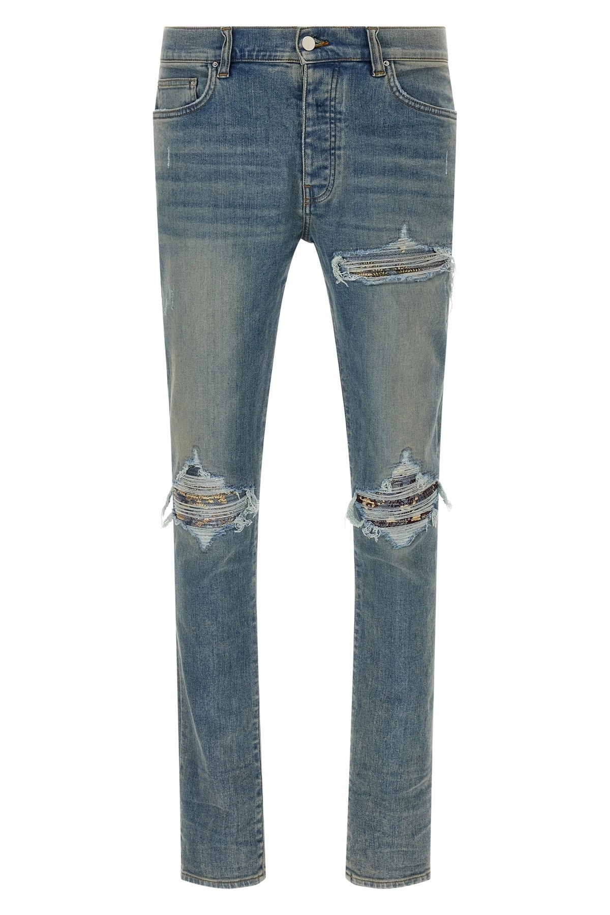 cod. AMDNSY1172MEDIUMINDIGO 'Crane MX1' used-effect stonewashed stretch cotton denim jeans with visible repair in ribbed damask fabric, front button closure, five pockets, and back leather logo tag. Color: Blue Size & Fit: Slim fit Composition: 92% cotton, 8% elastane Made in: United States