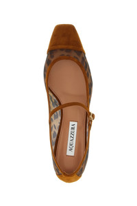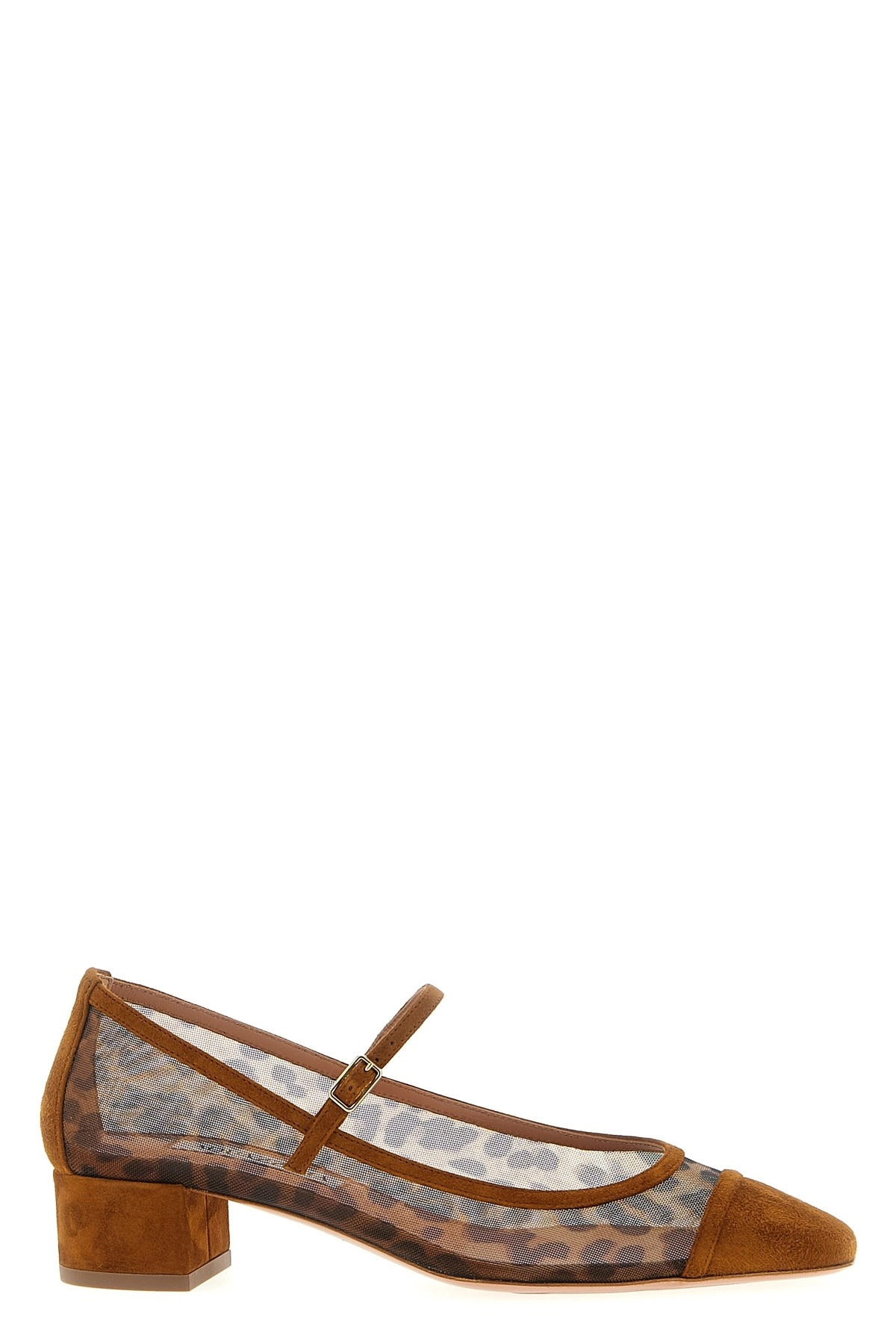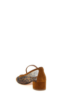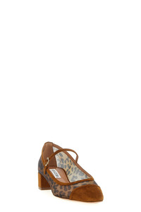 cod. MYHMIDP0LHDNATURALCOGNAC 'Mayor' pumps in solid suede and semi-transparent animal print mesh, square toe, adjustable strap, padded leather insole, big heel heel, leather sole. Color: Brown Size & Fit: EU WOMAN - Heels: 3.5 cm Composition: 70% textile, 30% goat leather Made in: Italy