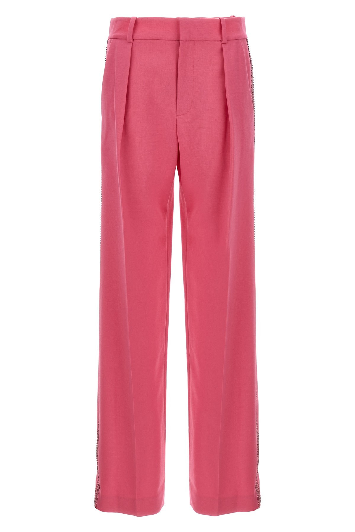 cod. 2303P13171CARMINEROSE Crystal Embellished' wool pants with rhinestone appliqué, pences and central pleat, pockets, zipper, hook and button closure. Color: Fuchsia Size & Fit: true to size fit US size Composition: 99% virgin wool 1% lyly Made in: China