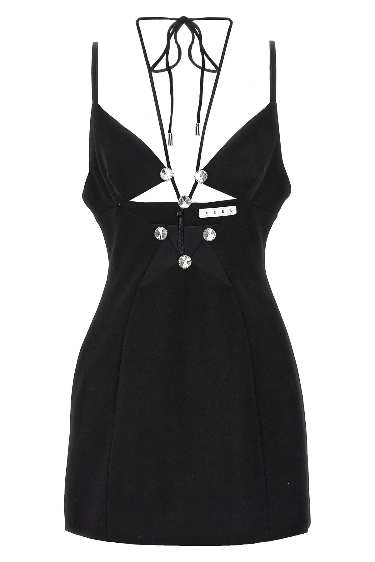 cod. 2401D22184BLACK 'Star Cut Out' dress with cut-out details and front rhinestone appliqué, neck fastening, thin straps, and back zip closure. Color: Black Size & Fit: true to size fit Composition: 67% rayon 28% nylon 5% elastane Made in: China