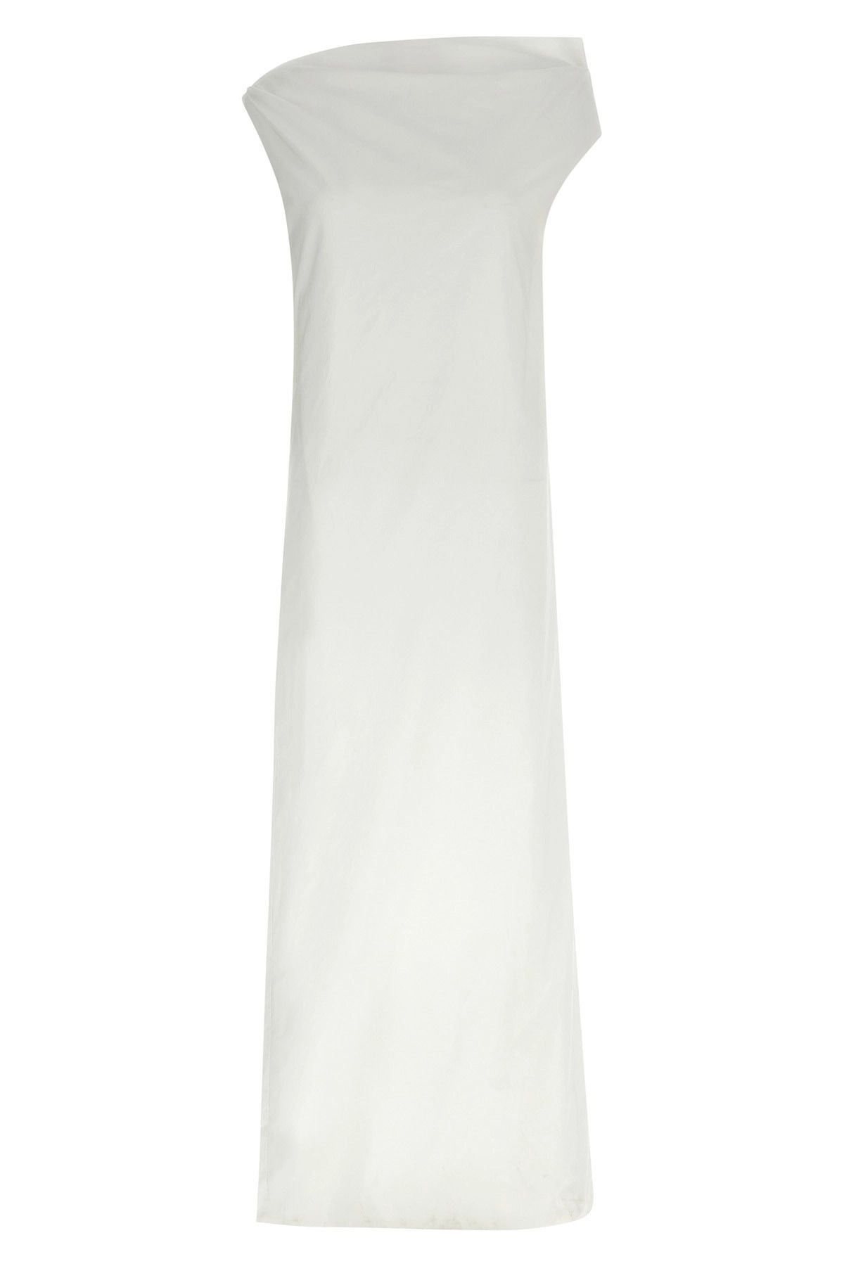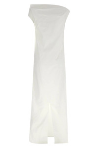 cod. ARMTMD025C010001 Long 'Tiche' dress in stretch cotton poplin with one shoulder style with draping, asymmetric boat neck, straight silhouette, back slit Color: White Size & Fit: true to size fit Composition: 56% cotton, 44% eme Made in: Italy