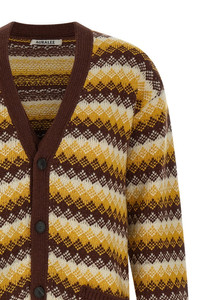 cod. A25AC03ECBURGUNDYYELLOW Cashmere and wool cardigan with jacquard pattern with solid color details, V-neck, front button closure, pockets, long sleeves with cuffs and dropped shoulders. Color: Multicolor Size & Fit: oversized fit Composition: 95% cashmere 5% wool Made in: Japan