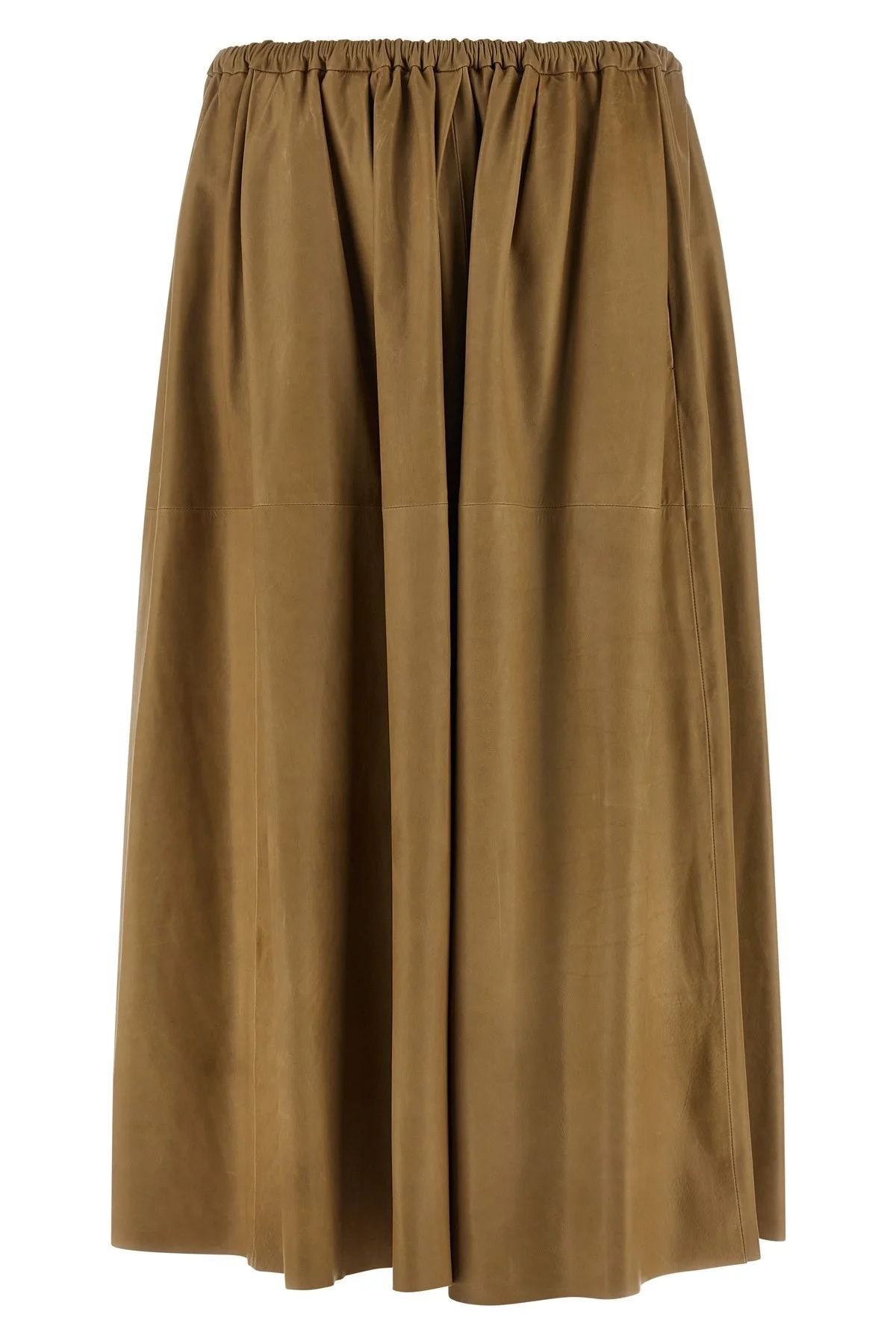 cod. A26SS03CBKHAKIBEIGE Midi skirt in fine calf leather with ultra-thin and lightweight finish, elastic waistband with drawstring to create curls, panel construction, flared silhouette, pockets. Color: Beige Size & Fit: true to size fit Composition: 100% calfskin leather (Bos Taurus) Made in: Japan