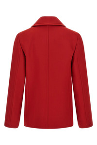 cod. A25AC03WDDUSTYRED Double breast twisted wool coat with front button closure, lapel collar, pockets, long sleeves, cupro lining. Color: Red Size & Fit: true to size fit Composition: 100% wool Made in: Japan