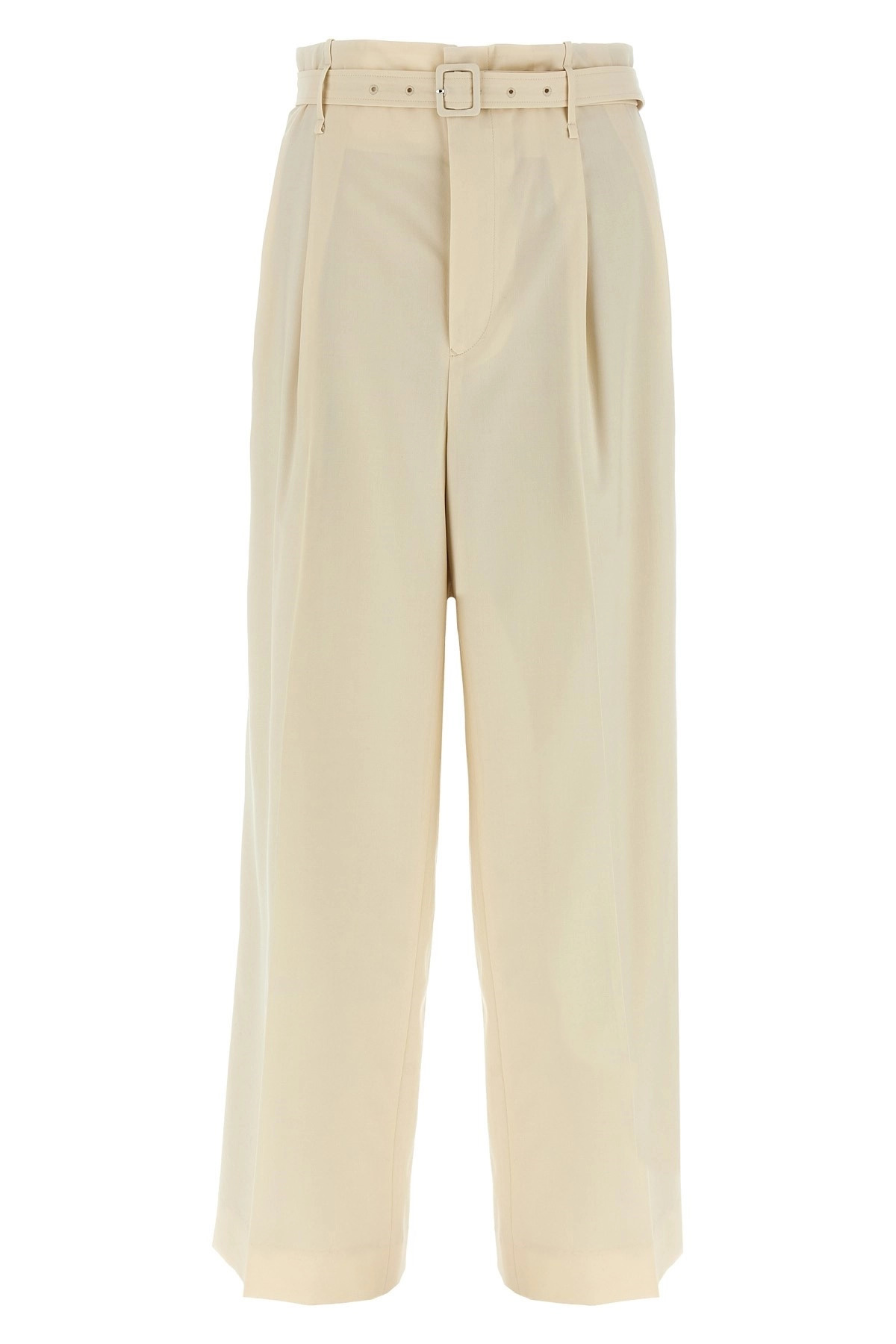 cod. A25SP04MTIVORY High density Tropical Wool pants with ultra-fine Super 180 wool yarns, high waist model with wide leg, cupro lining, front pincers, stretched pleat, pockets, removable belt. Color: Beige Size & Fit: true to size fit Composition: 100% wool Made in: Japan