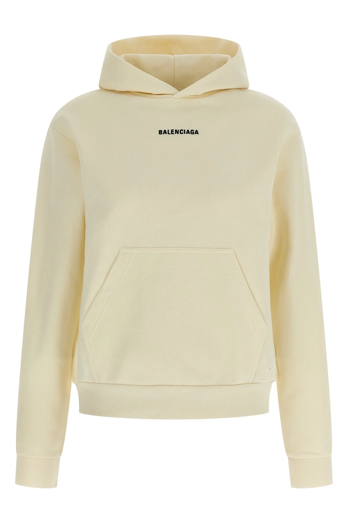 cod. 851238TTVJ29020 Dry fleece hoodie with embroidered 'Balenciaga Back' pattern on the front and back, kangaroo pocket, long sleeves with cuffs and dropped shoulders, band on the hem. Color: Beige Size & Fit: medium fit Composition: 100% cotton Made in: Portugal