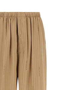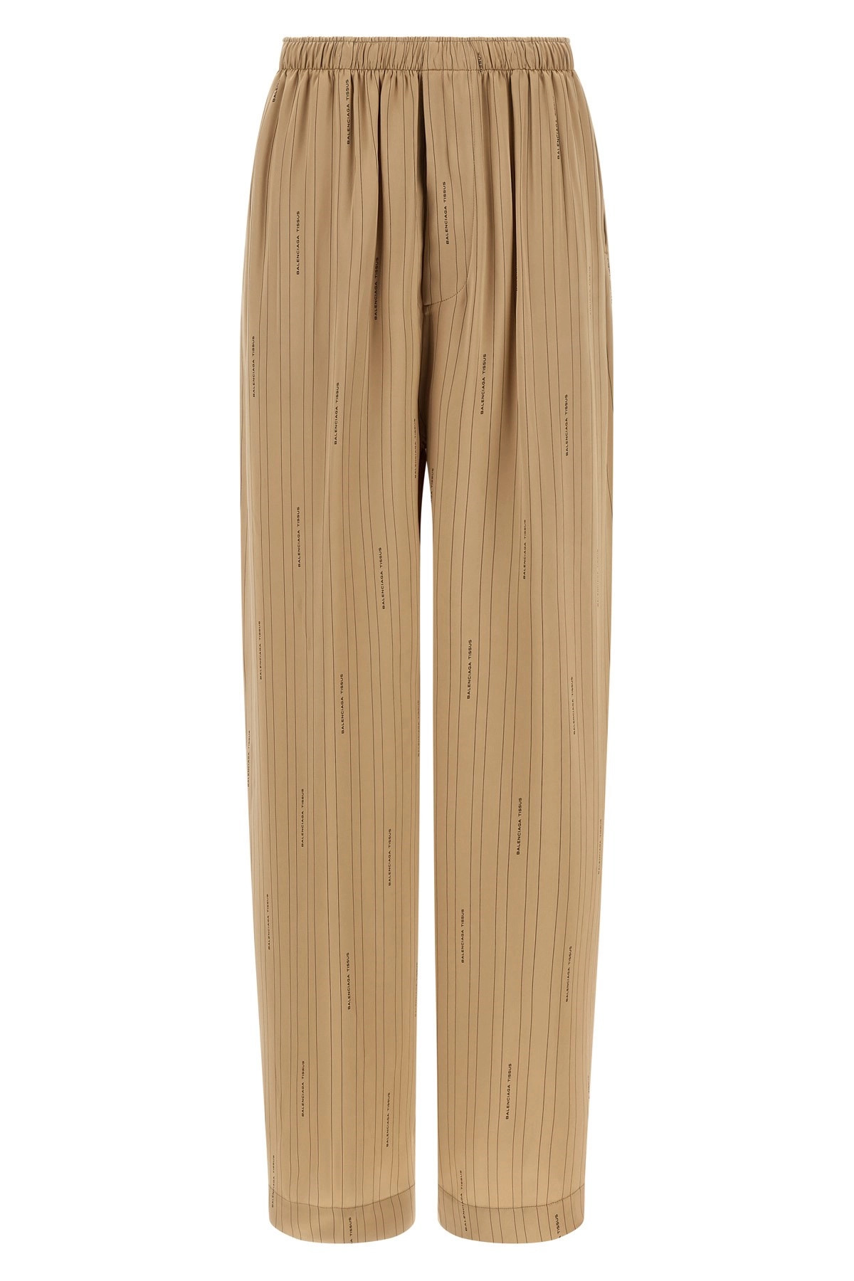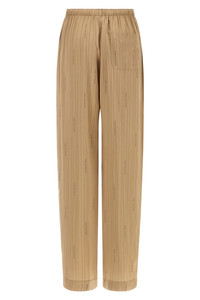 cod. 847154TSLA62684 'Coocon' striped fluid viscose pants with all-over 'Balenciaga Tissus' logo, wide leg, adjustable drawstring elastic at the waist, button flap, pockets. Color: Beige Size & Fit: large fit - FRENCH size Composition: 100% viscose Made in: Portugal
