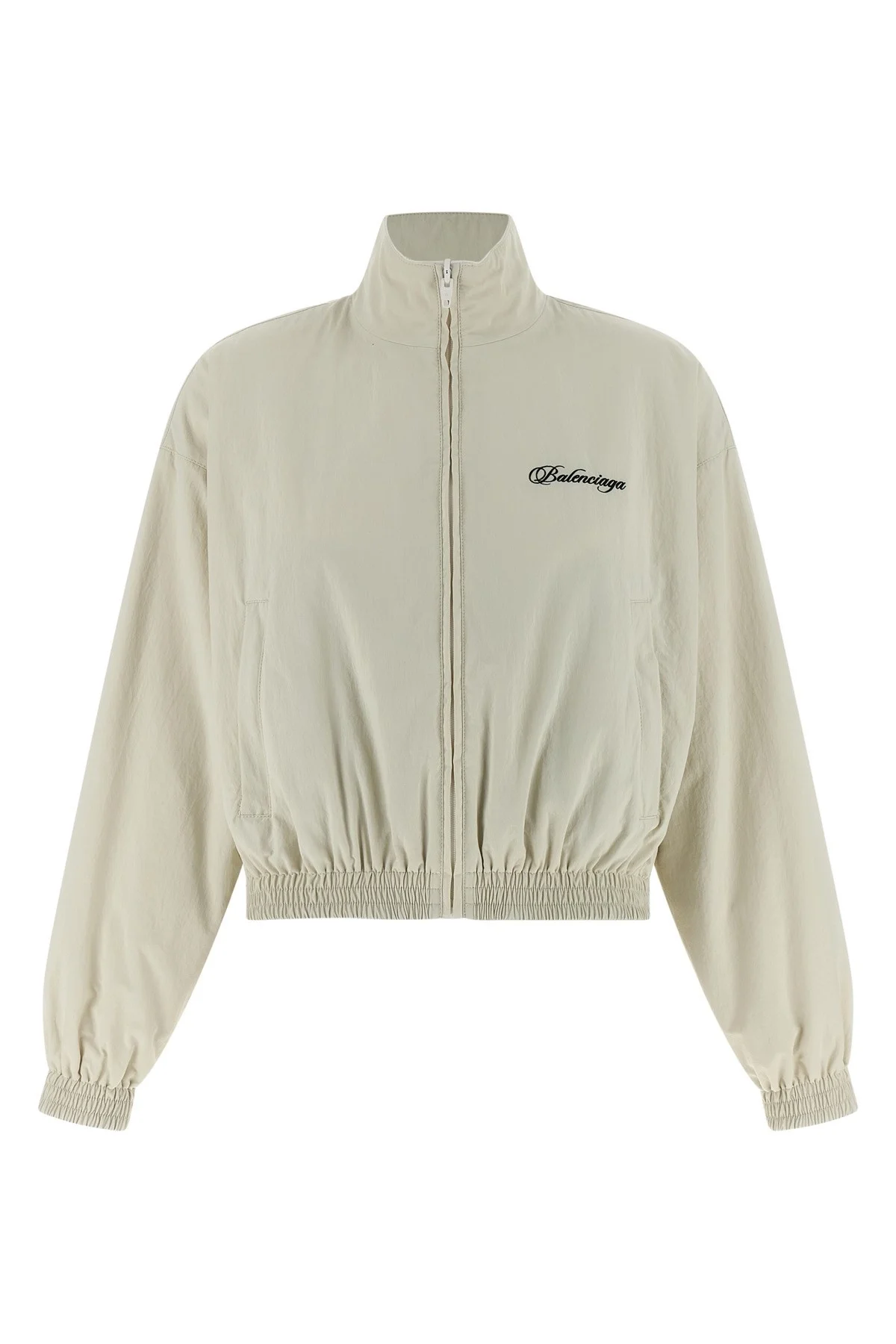 cod. 857746TTO049012 Reversible jacket in nylon tracksuit canvas and dry fleece, 'Cursive' embroidery on the front and back, crop model, high neck, front zip closure, pockets, long sleeves with elastic cuffs and dropped shoulder, elastic on the hem. Color: White Size & Fit: Comfort fit Composition: 100% polyamide Made in: Italy