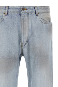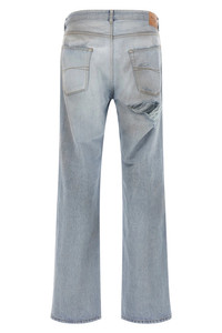 cod. 851352TTW744200 'Distressed' cotton denim jeans with dirty and worn effect details, contrast stitching, wide and straight leg, medium waist, front button closure, five pockets, back logo tag. Color: Light Blue Size & Fit: Comfort fit Composition: 100% cotton Made in: Japan