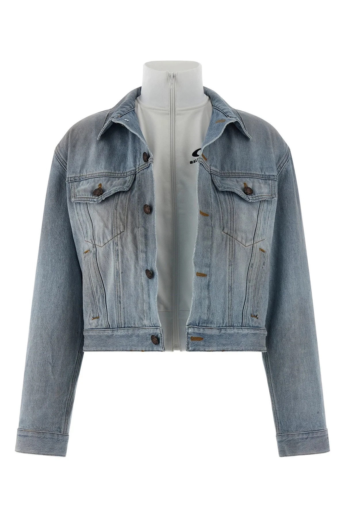 cod. 849904TTW744200 Stonewashed cotton denim jacket with stained and used effect, crop model, front double layer detail with high neck bib and cotton zip closure, contrast stitching, shirt collar, front button closure, pockets, long cuffed sleeves, cotton lining. Color: Light Blue Size & Fit: true to size fit Composition: 100% cotton Made in: Japan