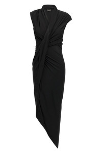 cod. 831200TRV231000 Draped jersey crepe midi dress with crossed V-neck, sleeveless, and asymmetrical hem. Color: Black Size & Fit: slim fit - FRENCH size Composition: 92% viscose, 8% elastane Made in: France