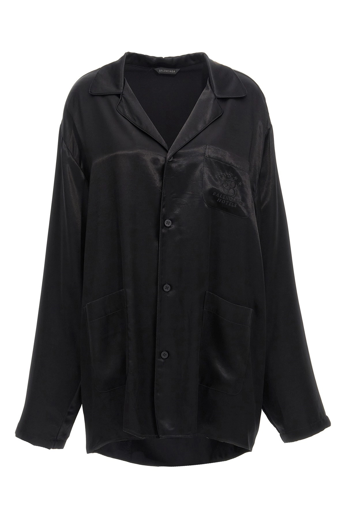 cod. 818436TLO281000 Viscose and cupro blend shirt, pajama model, pocket with tone-on-tone embroidered logo, button closure, long sleeves. Color: Black Size & Fit: oversized fit French size Composition: 58% viscose 42% cupro Made in: Italy