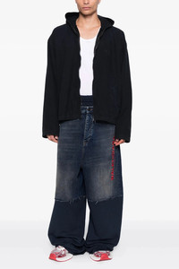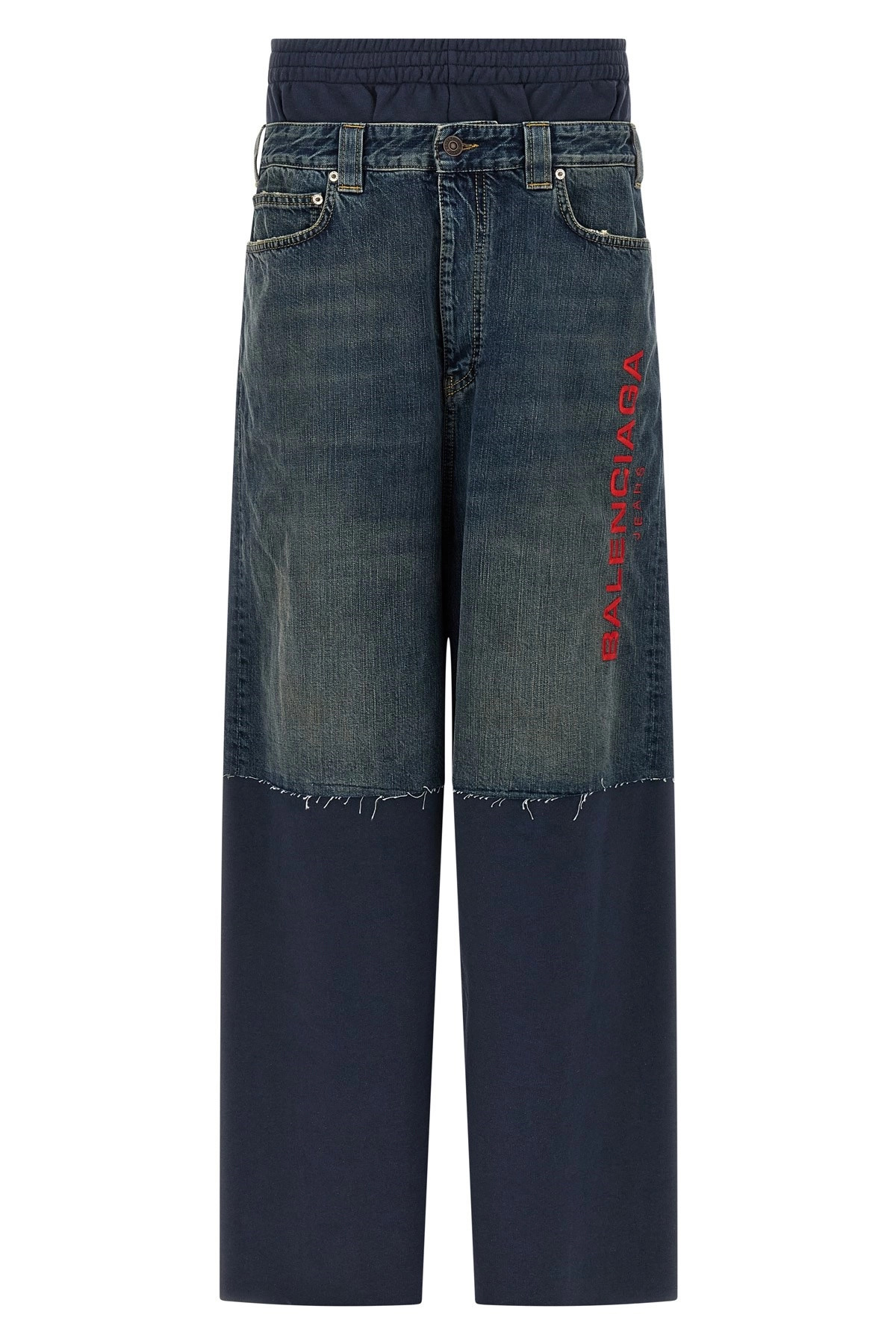 cod. 831646TSW714011 Fleece cotton joggers with central insert in used-effect denim, front logo embroidery, elastic with adjustable drawstring at the waist, wide leg, five pockets, back logo tag, leg bottoms with raw cut hem. Color: Blue Size & Fit: Relaxed fit Composition: 100% cotton Made in: Italy
