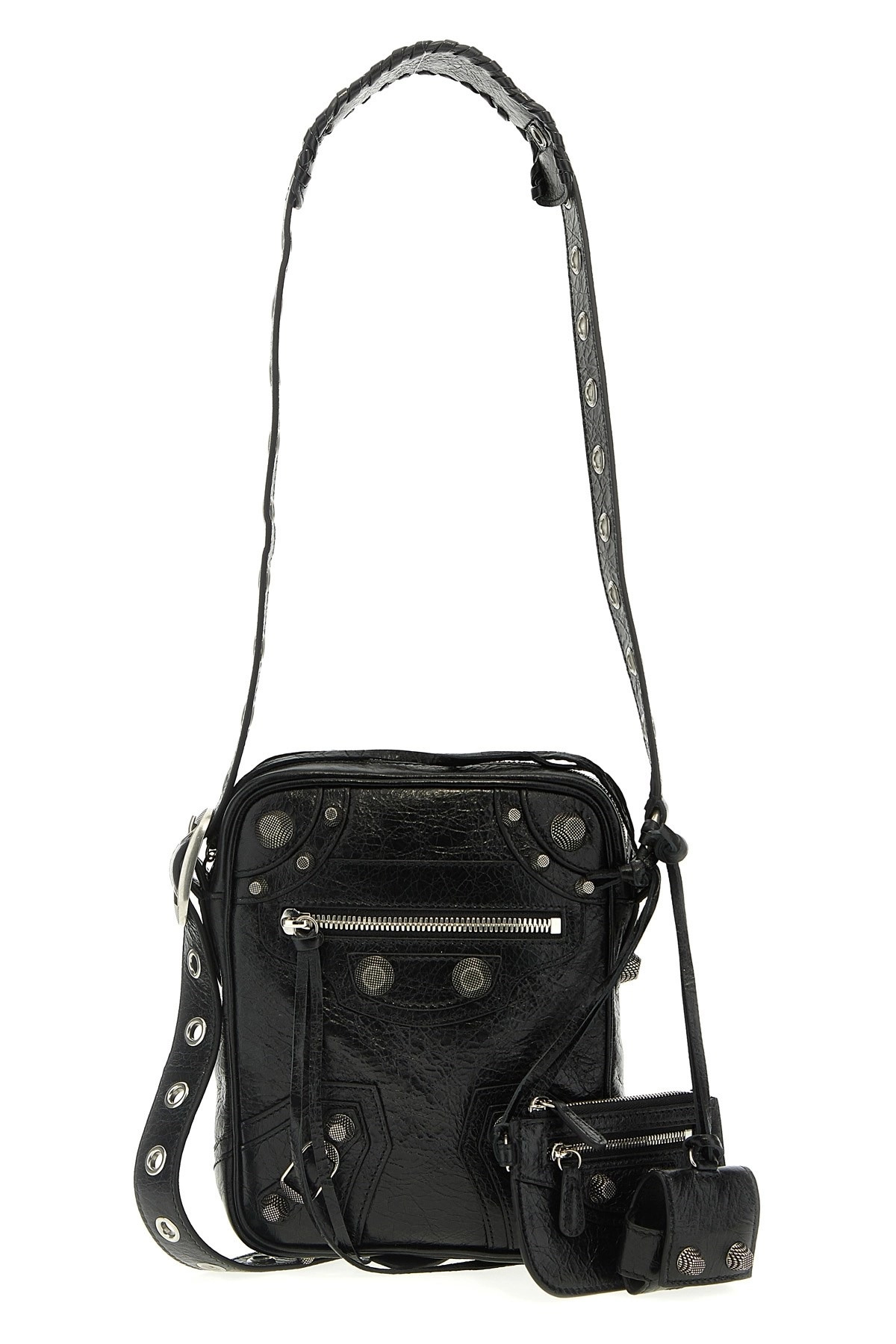 cod. 719065210KR1000 Arena lambskin 'Le Cagole Men' shoulder strap, zip closure, adjustable shoulder strap, removable AirPods Pro earphone case, and removable zippered clutch. Color: Black Size & Fit: W 16 x H 20 cm Composition: 100% lamb leather