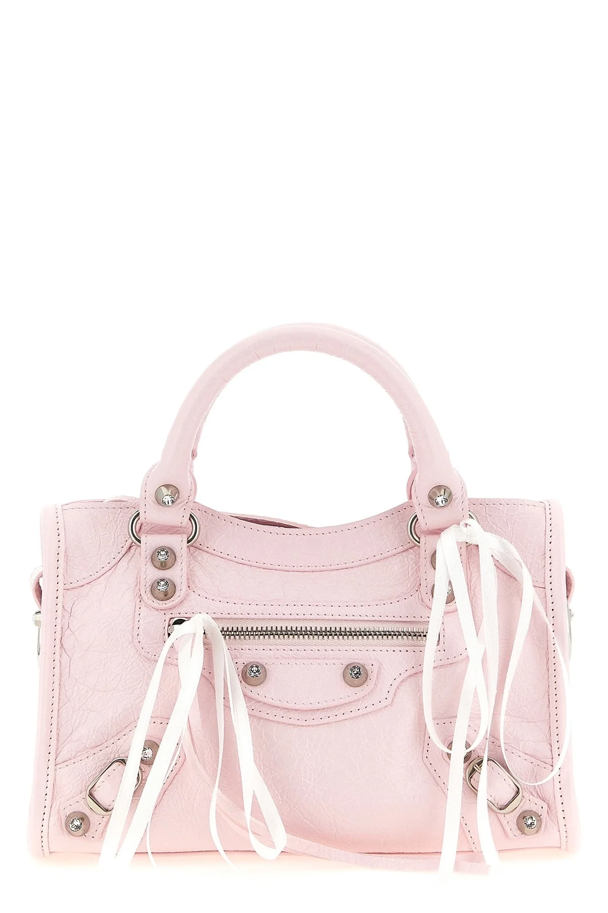 cod. 8063952AB8Z5790 Arena Storico 'Le City Mini' lambskin handbag with crystal studs, double fixed handle, top zip closure, front zip pocket, cotton canvas lining, adjustable and removable shoulder strap. Color: Pink Size & Fit: W 24 x H 16 x D 6.5 cm Composition: 100% lamb leather (Ovis aries) Made in: Italy
