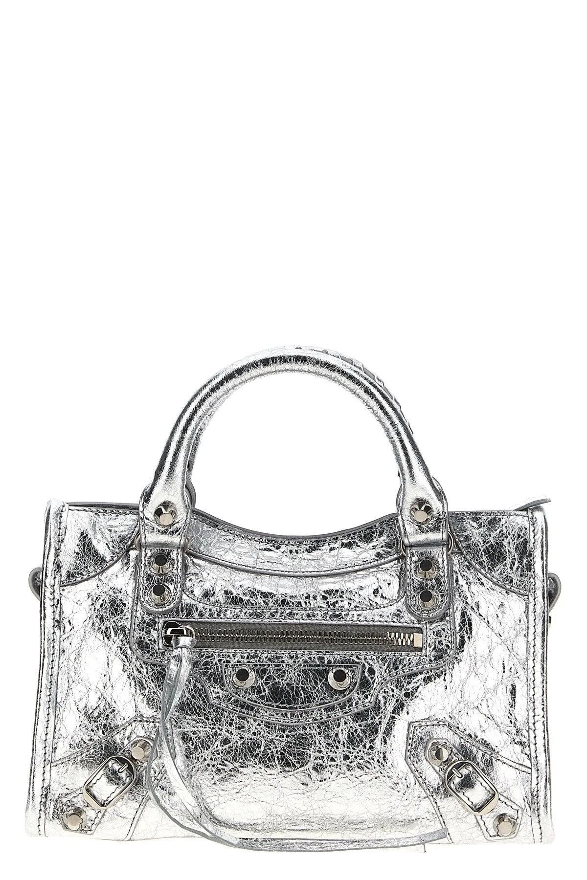 cod. 8063952AA9R8122 Arena metallic 'Le City Mini' lambskin handbag with double handle, zip closure, stud application, removable shoulder strap. Color: Silver Size & Fit: W 23.8 x H 16 x D 6.3 cm Composition: 100% lamb leather Made in: Italy