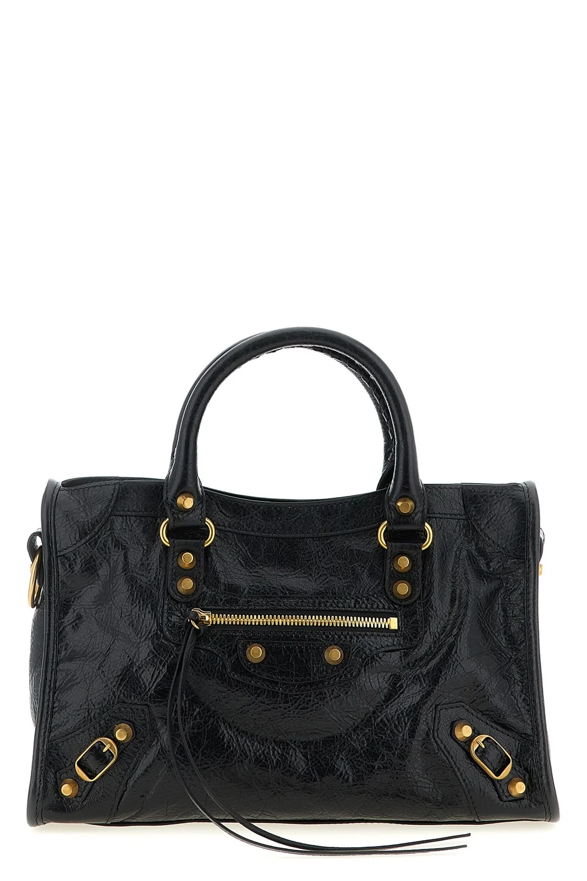 cod. 811442210F61000 Arena Storico 'Le City S' lambskin handbag with antiqued gold studs, double fixed handle, top zip closure, front zip pocket, cotton canvas lining, adjustable and removable shoulder strap. Color: Black Size & Fit: W 29 x H 19 x D 10.5 cm Composition: 100% lamb leather (Ovis aries) Made in: Italy
