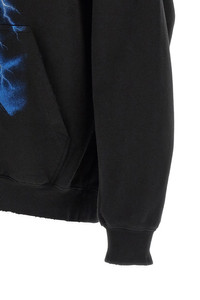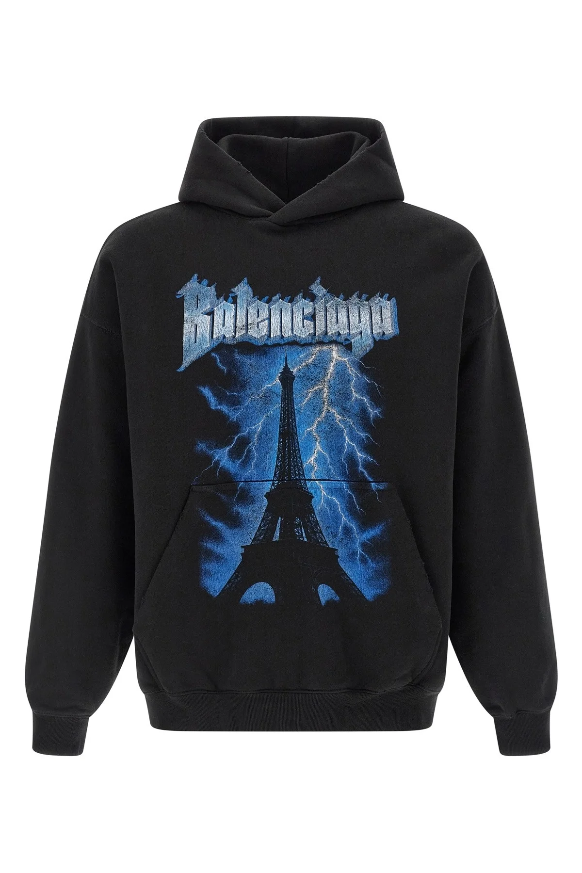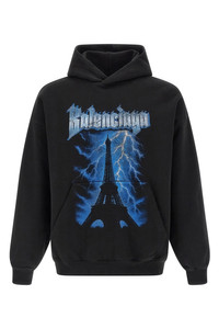 cod. 871956TUVF41000 Dry used-effect fleece hoodie with front 'Paris Thunderstorm' print, kangaroo pocket, long sleeves with cuffs and dropped shoulders, and headband. Color: Black Size & Fit: medium fit Composition: 100% cotton Made in: Portugal
