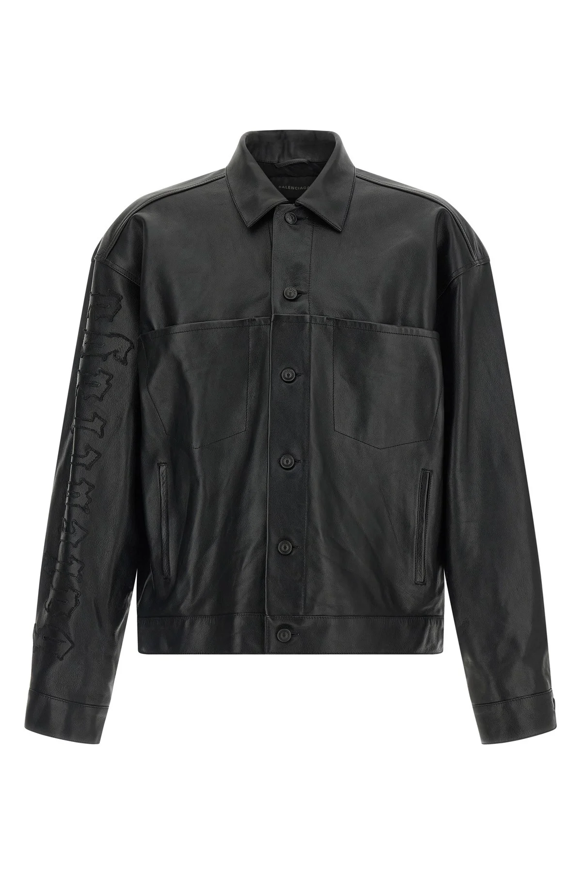 cod. 856343TMS031000 Shirt-style jacket in garnet buffalo leather with tone-on-tone 'Gothic Denim' pattern embroidered on the right sleeve, front metal button closure, pockets, long raglan sleeves with cuffs and dropped shoulder, cupro lining. Color: Black Size & Fit: oversized fit Composition: 100% buffalo leather Made in: Italy