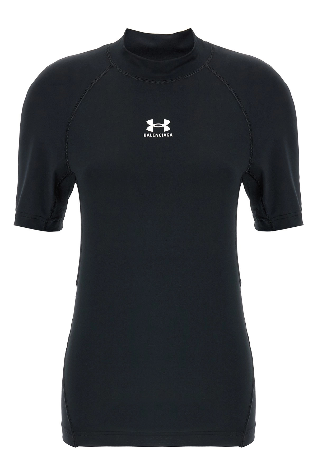 cod. 816222TRVY31000 Under Armour® T-shirt in light spandex with logo print on the front and back, mock collar, and short sleeves. Color: Black Size & Fit: bodycon fit Composition: 85% polyester, 15% elastane Made in: Portugal