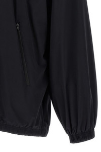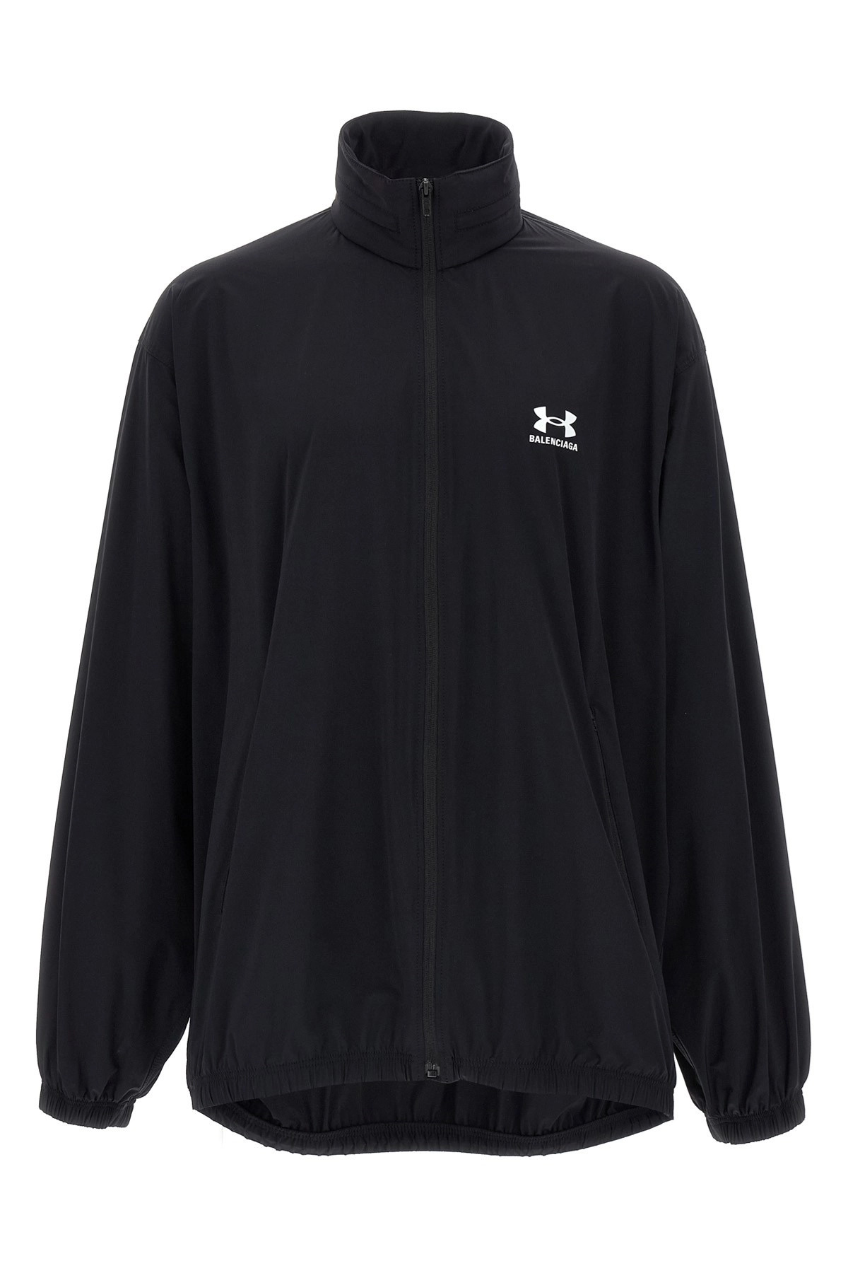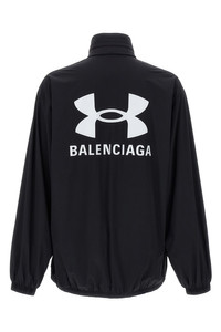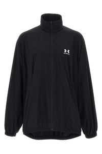 cod. 814127TQO351000 Under Armour® windproof jacket in technical fabric with front and back logo print, zip closure, high neck with removable hood, elastic hem, long sleeves with elastic cuffs. Color: Black Size & Fit: Oversized fit Composition: 85% polyamide, 15% elastane Made in: Italy