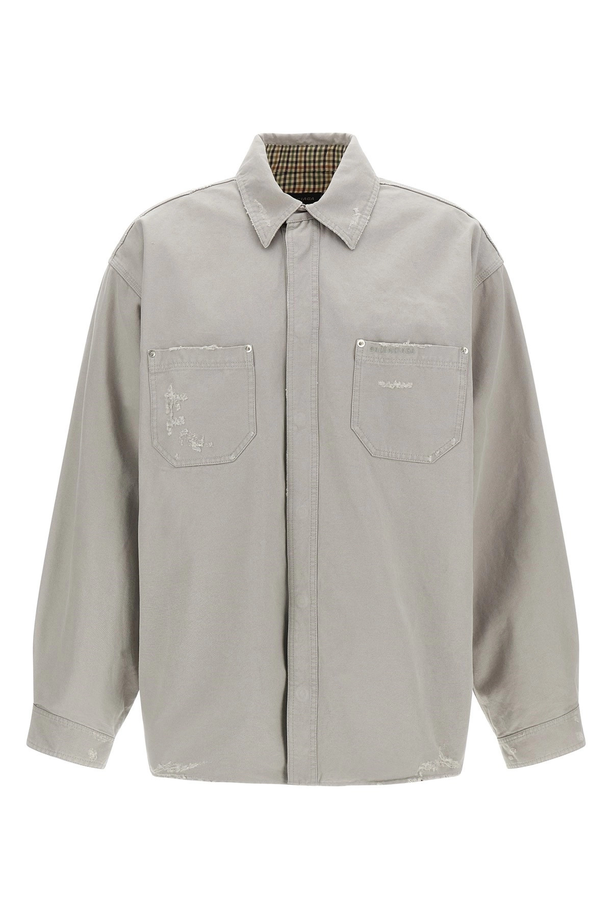 cod. 839085TRP151400 'Workwear' overshirt in heavy used-effect cotton canvas, contrasting patterned cotton lining, tone-on-tone logo embroidery and front snap button closure, pockets, long sleeves with cuffs and dropped shoulders. Color: Gray Size & Fit: Large fit Composition: 100% cotton Made in: Italy