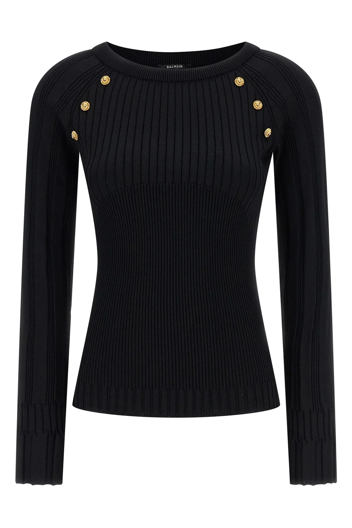 cod. GF1ARA60KJ450PA Stretch viscose sweater, crew neck, 3 symmetrical side 'Testa di leone' buttons, long sleeves. Color: Black Size & Fit: True to size fit French sizing Composition: 75% viscose, 25% polyamide Made in: France
