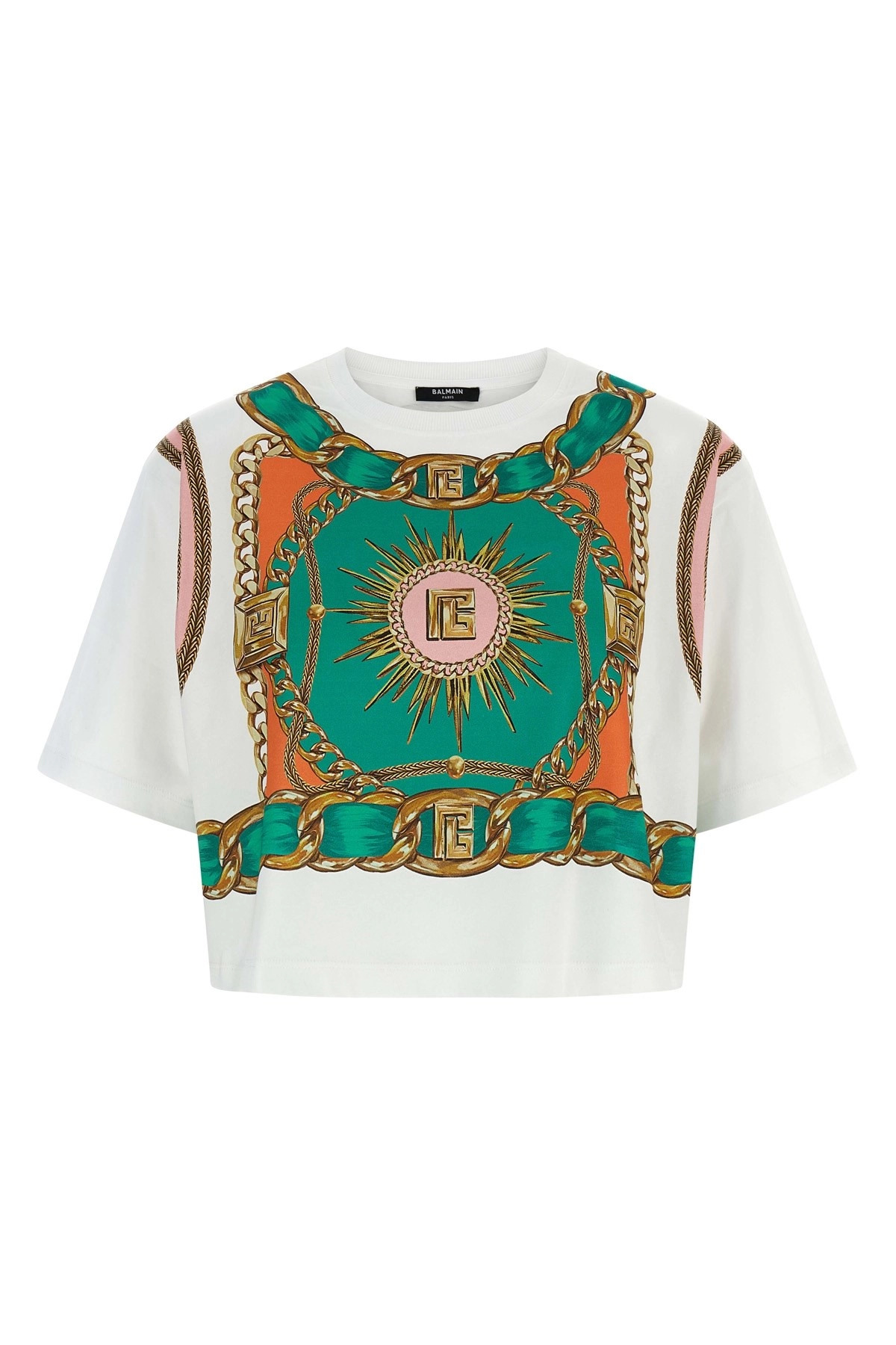 cod. FF1EE020GF01GSR Cotton cropped T-shirt with 'Balmain Foulard' print on the front and back, crew neck, and short sleeves with dropped shoulders. Color: Multicolor Size & Fit: true to size fit Composition: 100% cotton Made in: Portugal