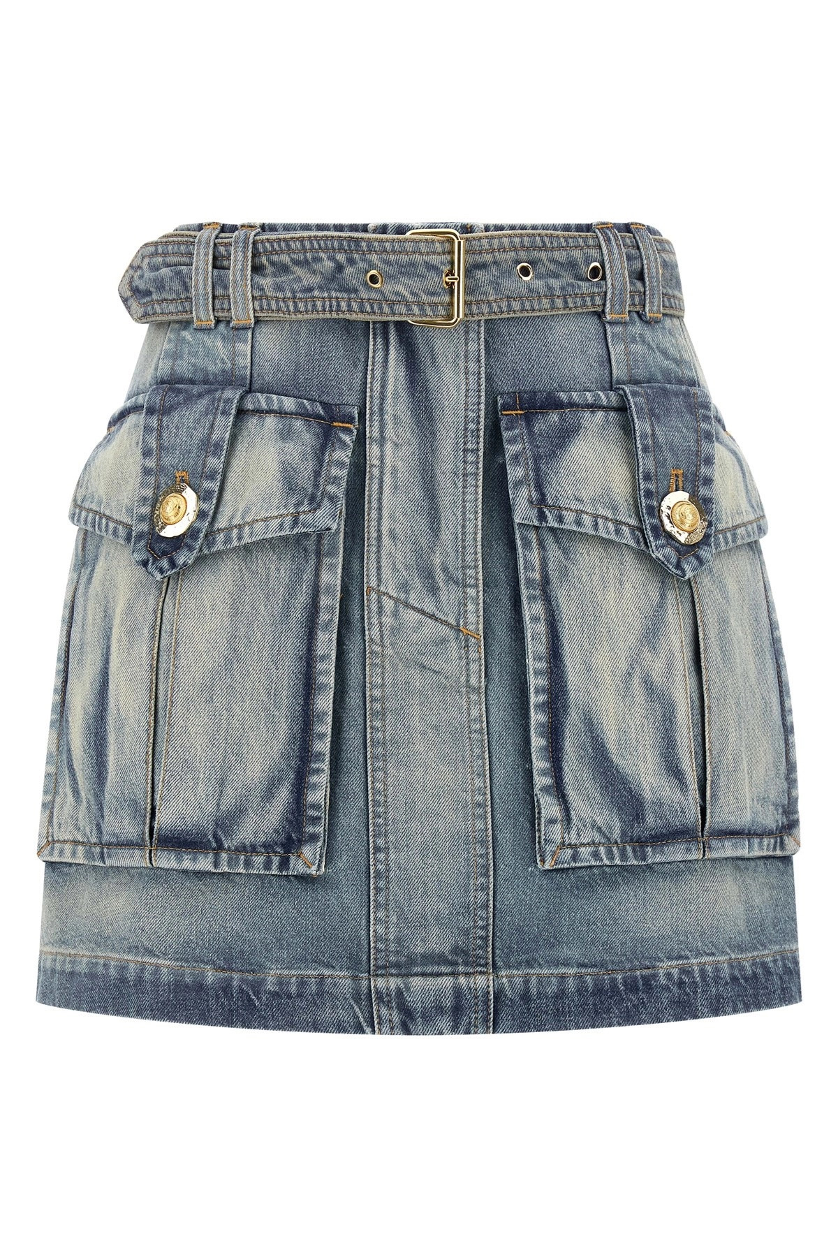 cod. FF1LBA88DF796FC Stonewashed cotton denim mini skirt, cargo pockets with metal 'Gold and Gold Coin' buttons, front zip and snap button closure, back pockets, adjustable and removable belt. Color: Light Blue Size & Fit: true to size fit - FRENCH size Composition: 100% cotton Made in: Italy