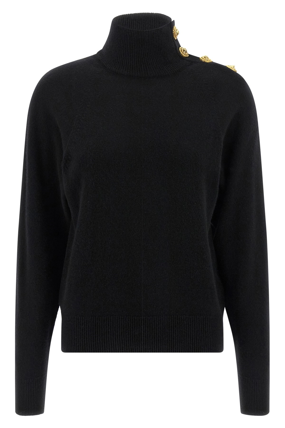 cod. FF0KF100KI870PA Wool and cashmere sweater with high neck, metal 'Testa di leone' button detail on the left shoulder, long bat sleeves with cuffs. Color: Black Size & Fit: true to size fit - FRENCH size Composition: 50% cachemire 50% virgin wool Made in: France