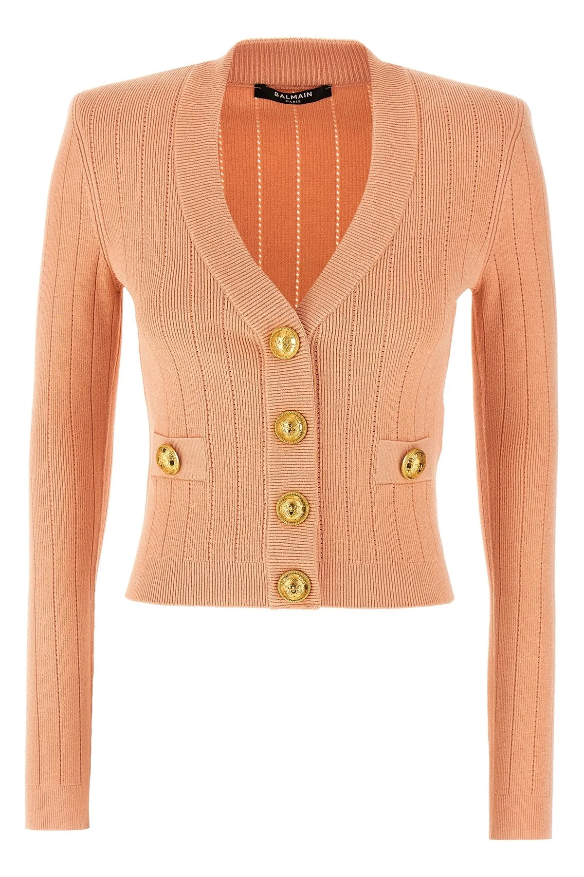 cod. DF1KL007KB070LB Knitted cardigan in viscose blend, gold metal 'Chiocciola' button closure, crop style with padded shoulders, long sleeves. Color: Pink Size & Fit: true to size fit French size Composition: 83% viscose, 17% polyester Made in: France