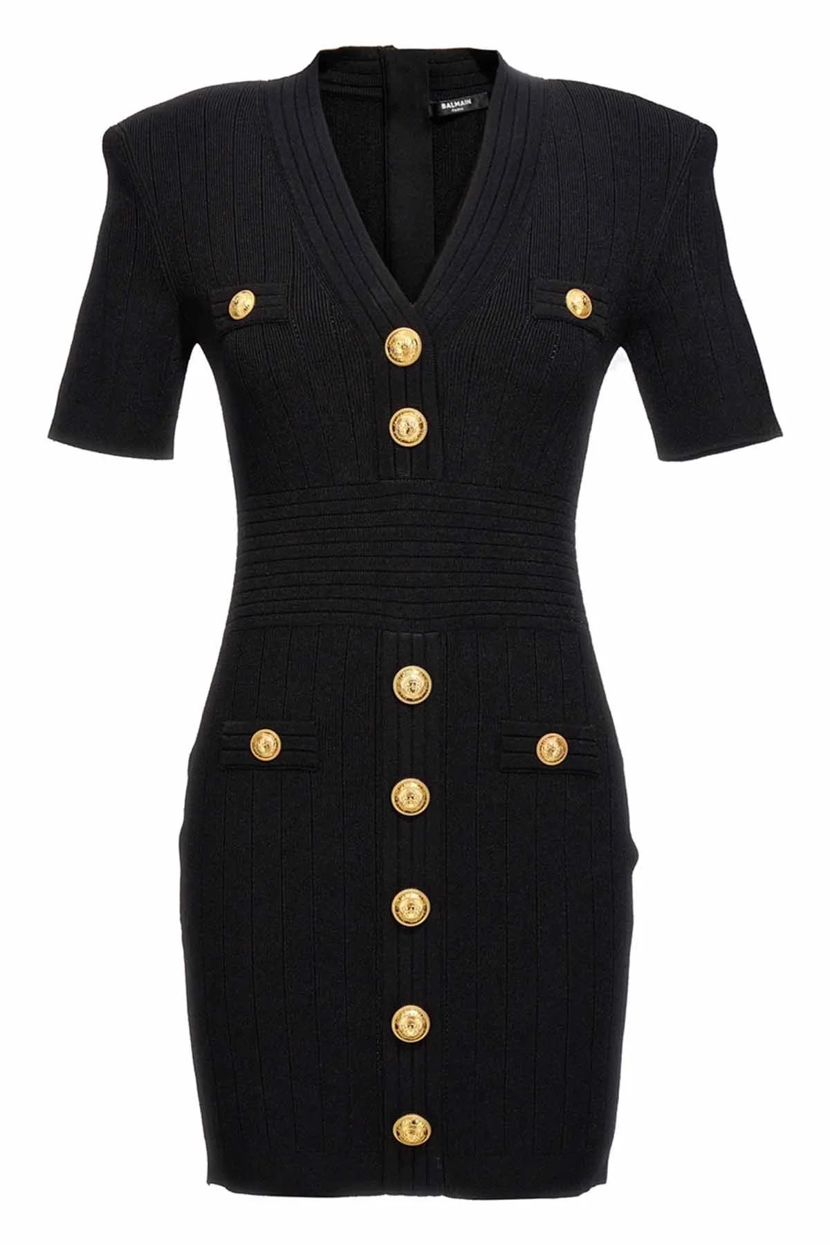 cod. EF1R6045KB070PA Ribbed knit dress, V-neck, padded shoulders, back zip closure, front 'Chiocciola' logo buttons and trompe-l'oeil pockets. Color: Black Size & Fit: true to size fit French size Composition: 83% viscose, 17% polyester Made in: Italy