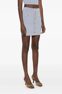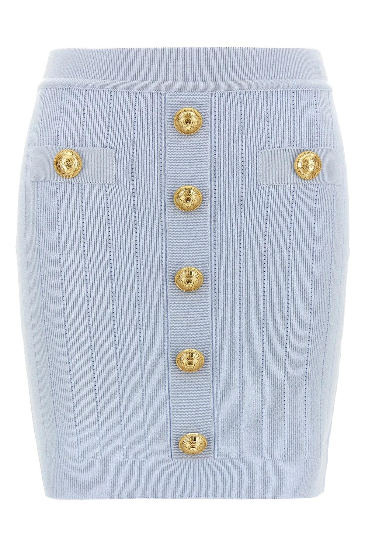 cod. EF1LB290KB076AC Stretch viscose blend skirt with 'Chiocciola' logo buttons, trompe-l'œil pockets and back zip closure. Color: Light Blue Size & Fit: true to size fit FRENCH size Composition: 83% viscose, 17% polyester Made in: Italy