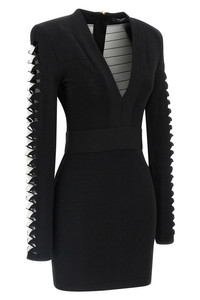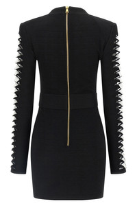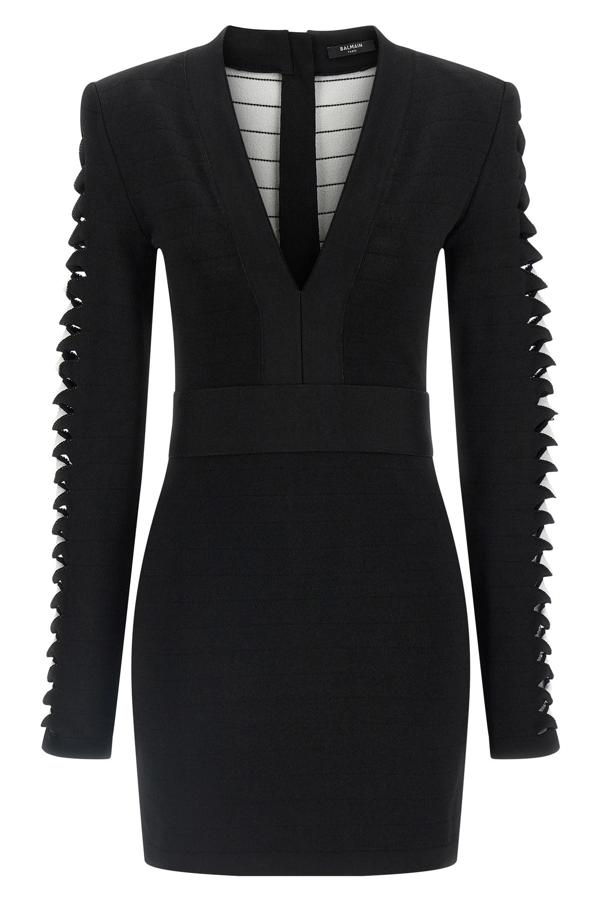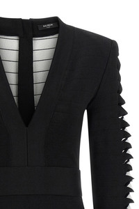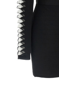 cod. FF0R8049KI98EAB Stretch viscose blend mini dress with cut-out details and fabric turn-ups on the sleeves, padded shoulders, deep front V-neck, back zip closure, long sleeves, unlined. Color: Black Size & Fit: true to size fit - FRENCH size Composition: 86% viscose 11% polyester 2% polyamide 1% elastane Made in: France