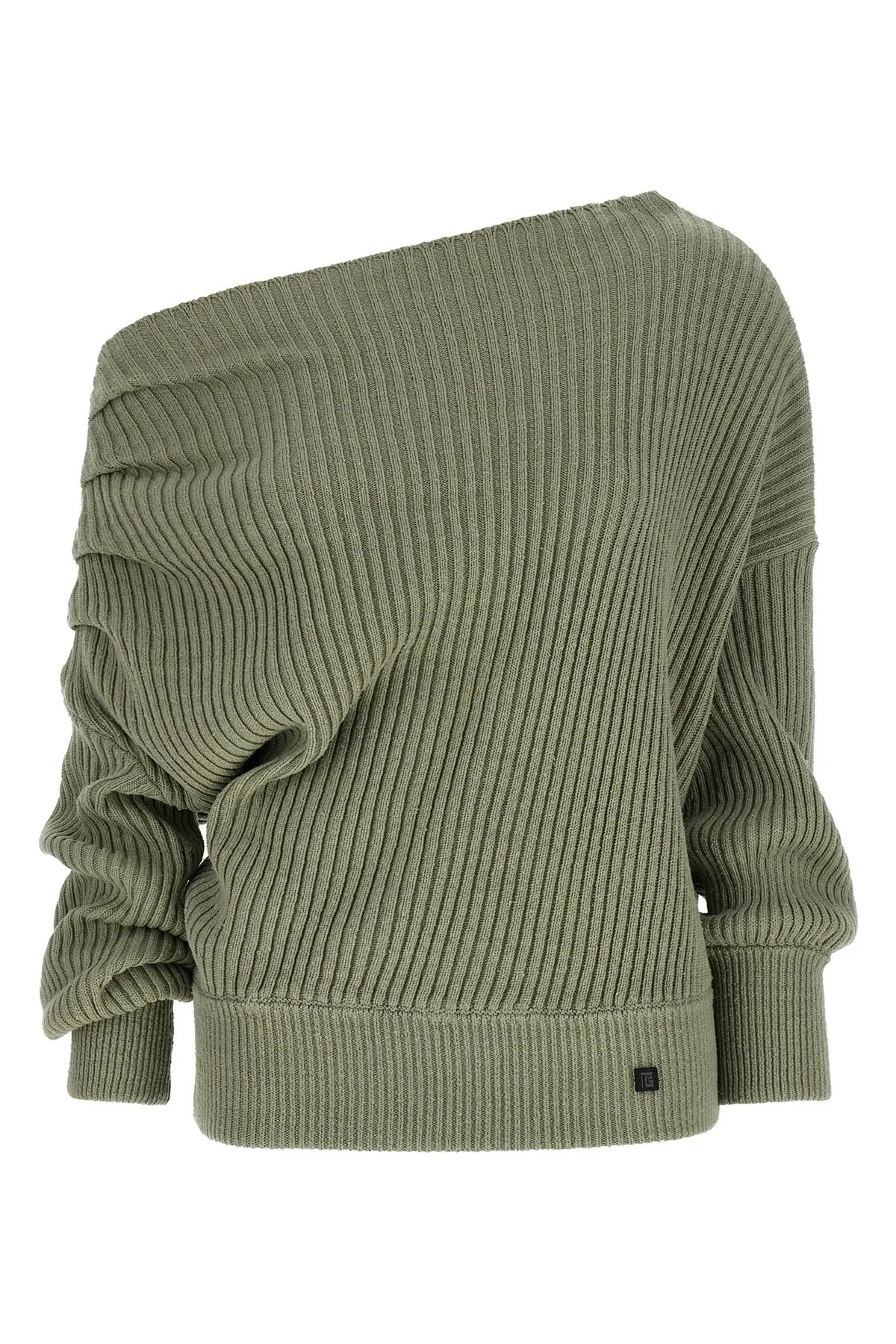 cod. GF0KK065KJ727EU Ribbed knit, asymmetric neckline. Folded with draping on the shoulder, front logo application, ribbed trim on the cuffs and on the bottom of the garment. Color: Green Size & Fit: Comfort fit Composition: 100% silk Made in: Italy