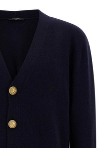 cod. FH1KL081KI876AJ Cashmere blend cardigan, V-neck, gold metal 'Leone' button closure, pockets, long sleeves. SUSTAINABLE: This product is made with 100% recycled and certified cashmere wool. Color: Blue Size & Fit: True to size fit Composition: 50% cachemire 50% virgin wool Made in: France