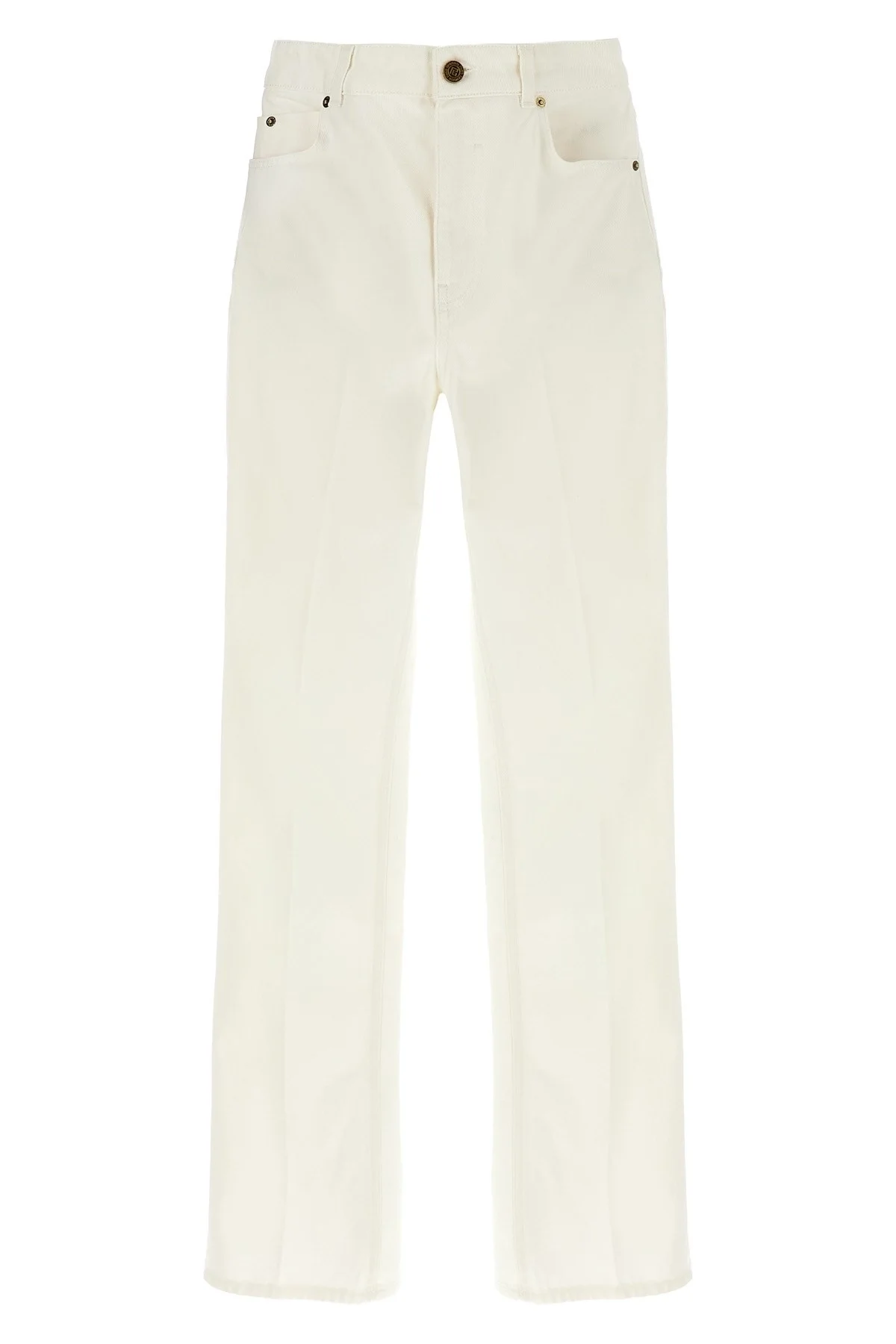 cod. GF1MI070DG140FC 5-pocket high waist cotton denim jeans with front stretched pleat, straight leg, front zip and button closure, 'Monogram' embroidery at the back, leather logo tag. Color: White Size & Fit: True to size fit French sizing Composition: 100% cotton Made in: Italy