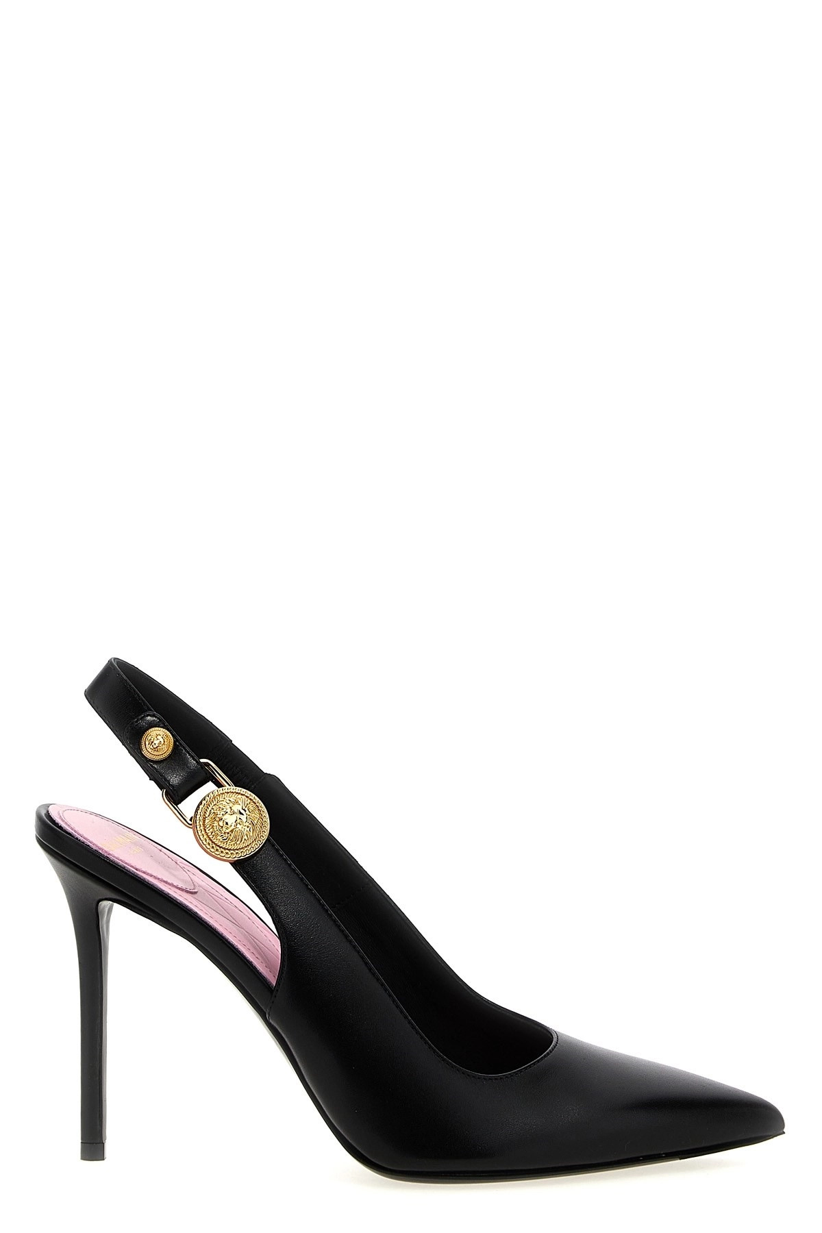 cod. DN1UK047LVIT0PA 'Eva' leather slingbacks with elastic strap with 'Lion's head' button and gold metal rings. Pointed toe, heel, leather sole. Color: Black Size & Fit: EU WOMEN Composition: 100% calfskin leather (Bos Taurus) Made in: Italy