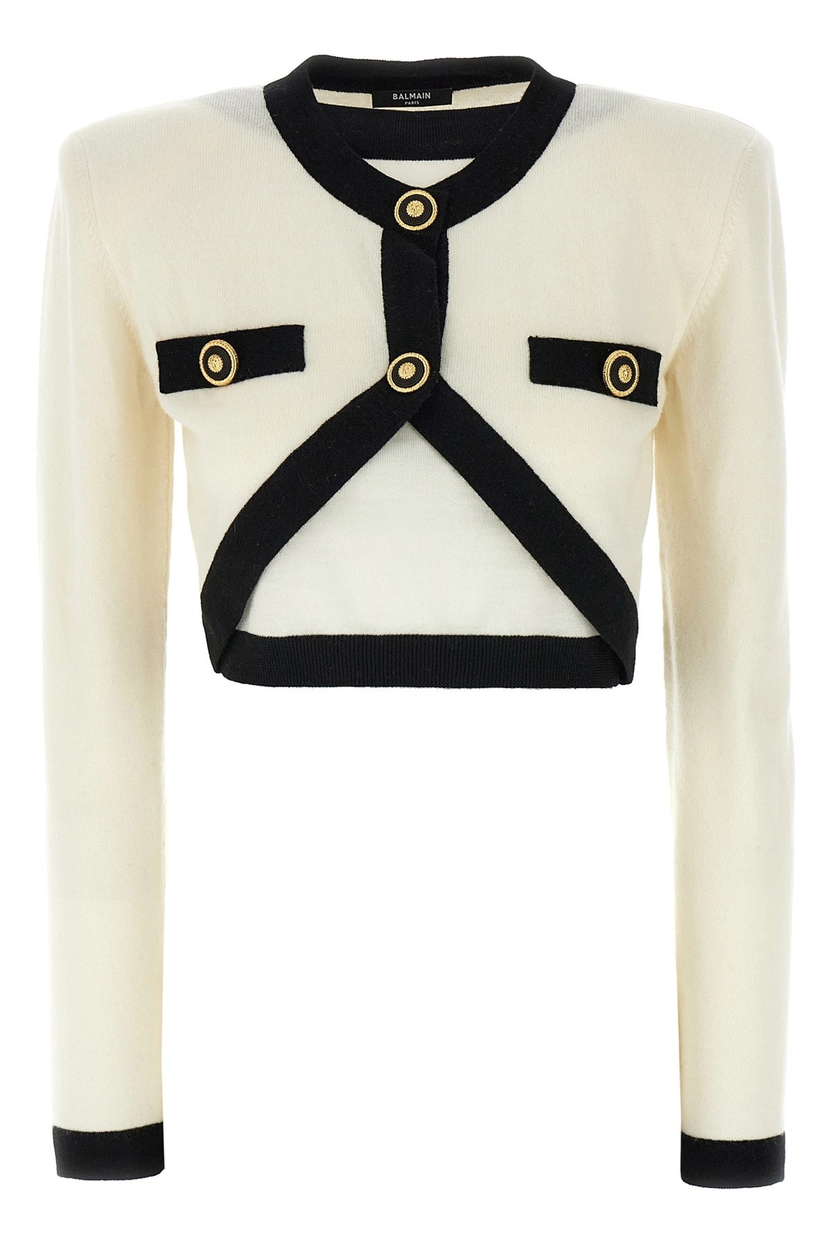 cod. EF1KA120KH91GAU Wool and cashmere blend sweater with trompe l'oeil details and 'Filo Leone Catena' buttons, layered cardigan, crew neck, padded shoulders, long sleeves. Color: White/Black Size & Fit: true to size fit French size Composition: 76% wool 24% goat cashmere Made in: Italy