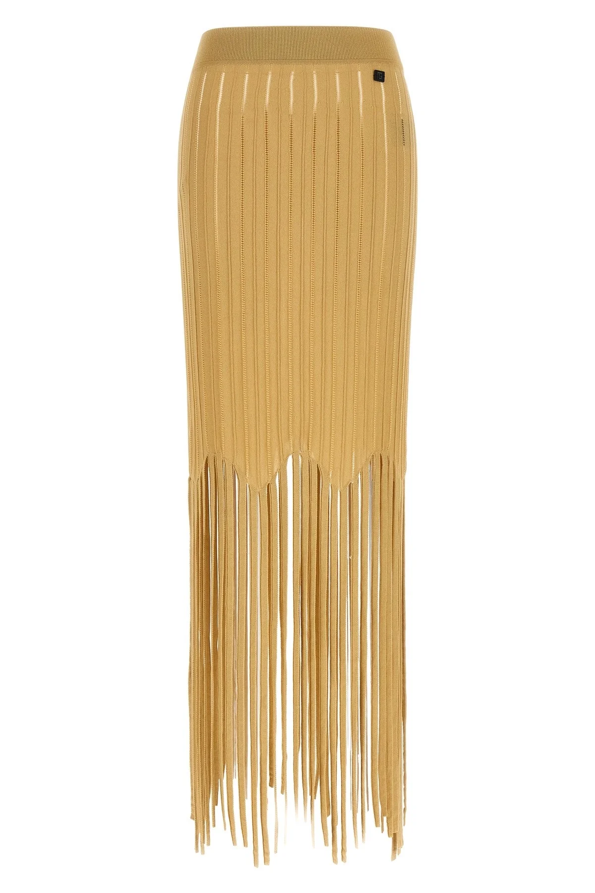 cod. GF0LC233KJ631GQ Midi skirt in stretch knit viscose cane, elastic waistband, fringes on the hem. Color: Beige Size & Fit: true to size fit - FRENCH size Composition: 75% viscose, 25% polyamide Made in: France