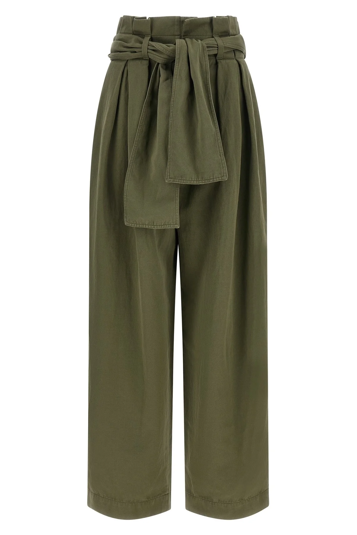 cod. GF0PQ285CG647EC Serge pants, extra wide and tapered leg, bag model with curled high waist, pins, zip hook and front button closure, French side pockets, matching belt to tie at the removable waist. Color: Green Size & Fit: true to size fit - FRENCH size Composition: 66% cotton, 34% linen Made in: Italy
