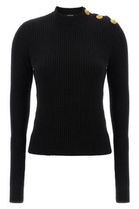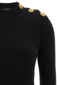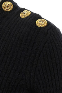 cod. FF0KD095KJ170PA Ribbed cashmere and virgin wool sweater, metal button detail on the left shoulder, crew neck, long sleeves. Color: Black Size & Fit: true to size fit - FRENCH size Composition: 50% cachemire 50% virgin wool Made in: France