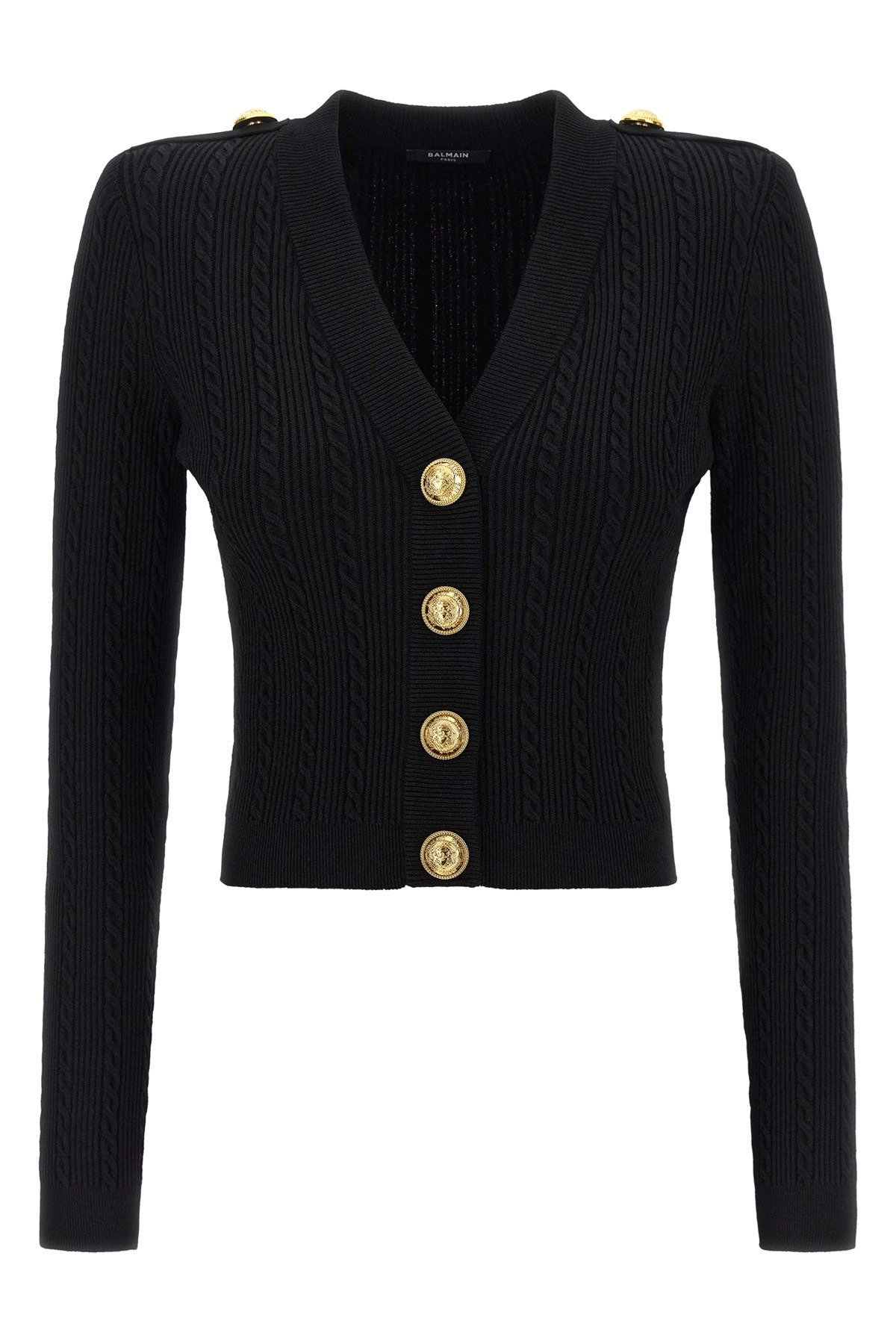 cod. FF1KL245KI500PA Ribbed knit cardigan and twisted, padded shoulder straps with decorative buttons applique, V-neck, front snap button closure with decorative metal 'Coin' buttons, long sleeves. Color: Black Size & Fit: slim fit - FRENCH size Composition: 83% viscose, 17% polyester Made in: France