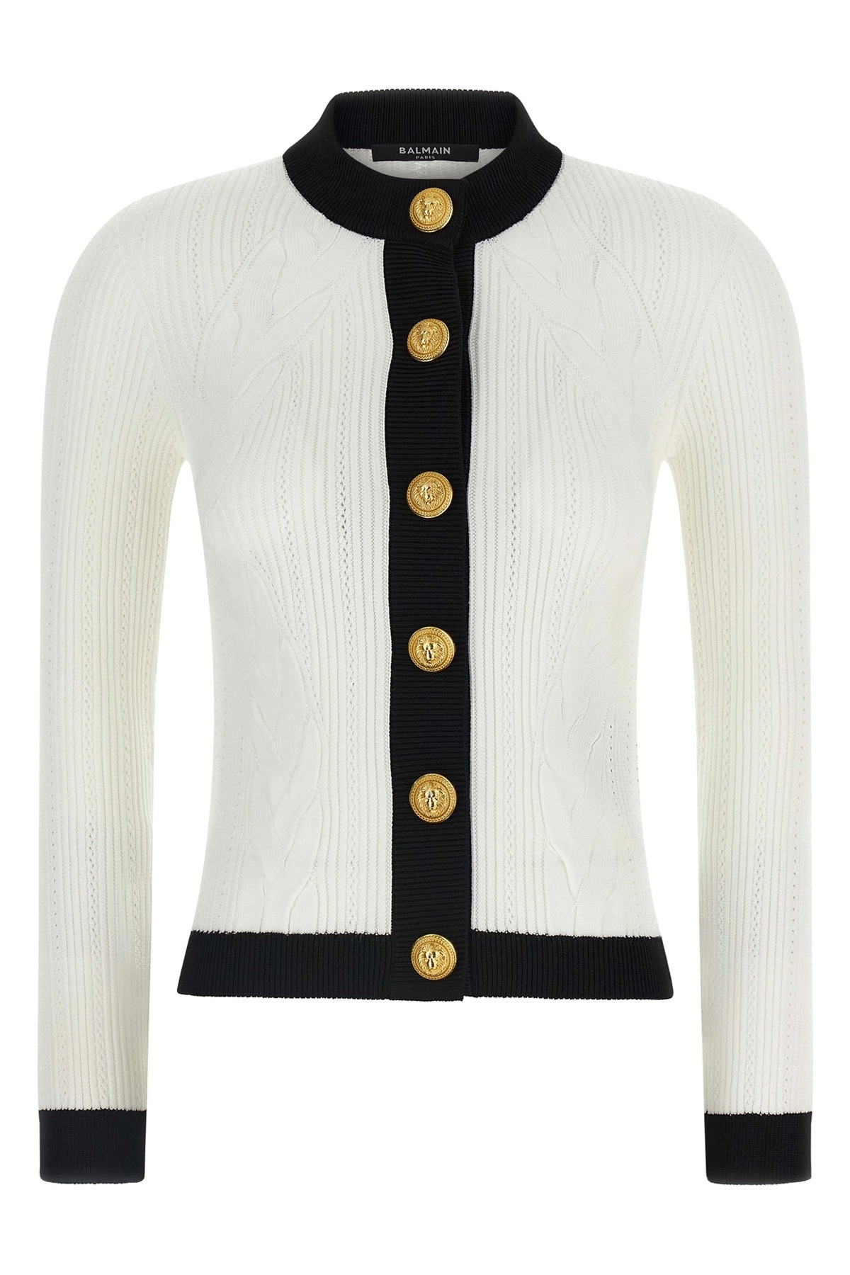 cod. FF1KL191KI64GAB Cardigan in two-tone stretch viscose crocheted, front snap button closure with decorative metal button applique, crew neck, long sleeves. Color: White/Black Size & Fit: true to size fit - FRENCH size Composition: 84% viscose, 16% polyester Made in: Italy