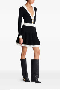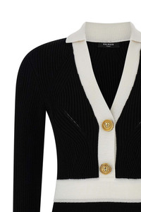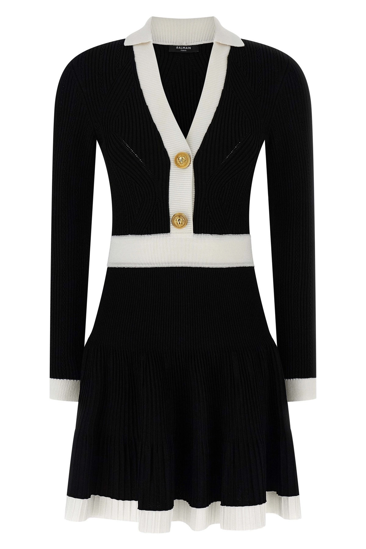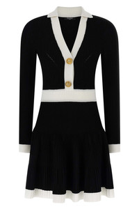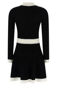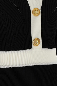 cod. FF1R9858KI64EAB Two-tone stretch knit crochet mini dress, V-neck, collar, front snap button closure with decorative metal button applique, long sleeves, full skirt with pleated effect. Color: White/Black Size & Fit: slim fit - FRENCH size Composition: 84% viscose, 16% polyester Made in: Italy