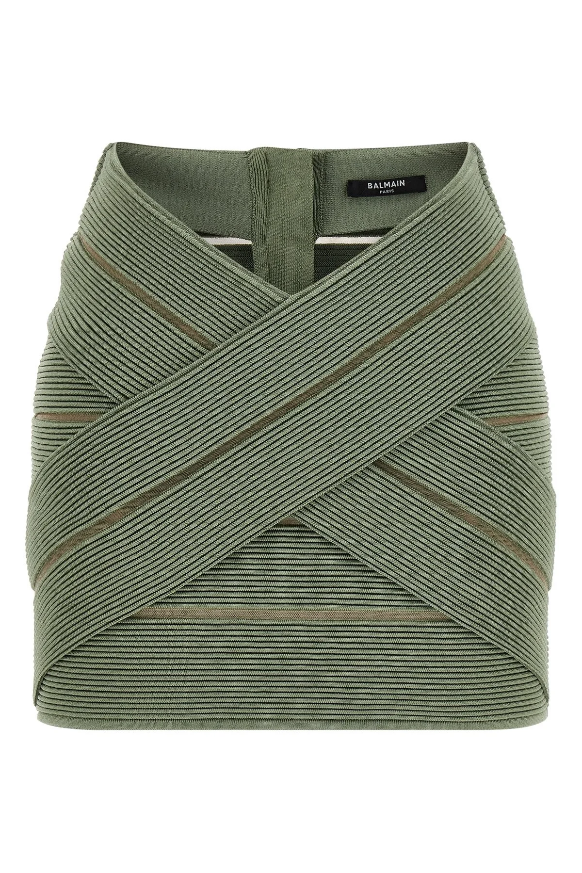 cod. GF0LBB48KJ757EU Stretch viscose mini skirt with transparent mesh inserts, V-waist with front X-shaped insert, back zip closure. Color: Green Size & Fit: true to size fit - FRENCH size Composition: 77% viscose 14% polyester 8% polyamide 1% elastane Made in: Italy