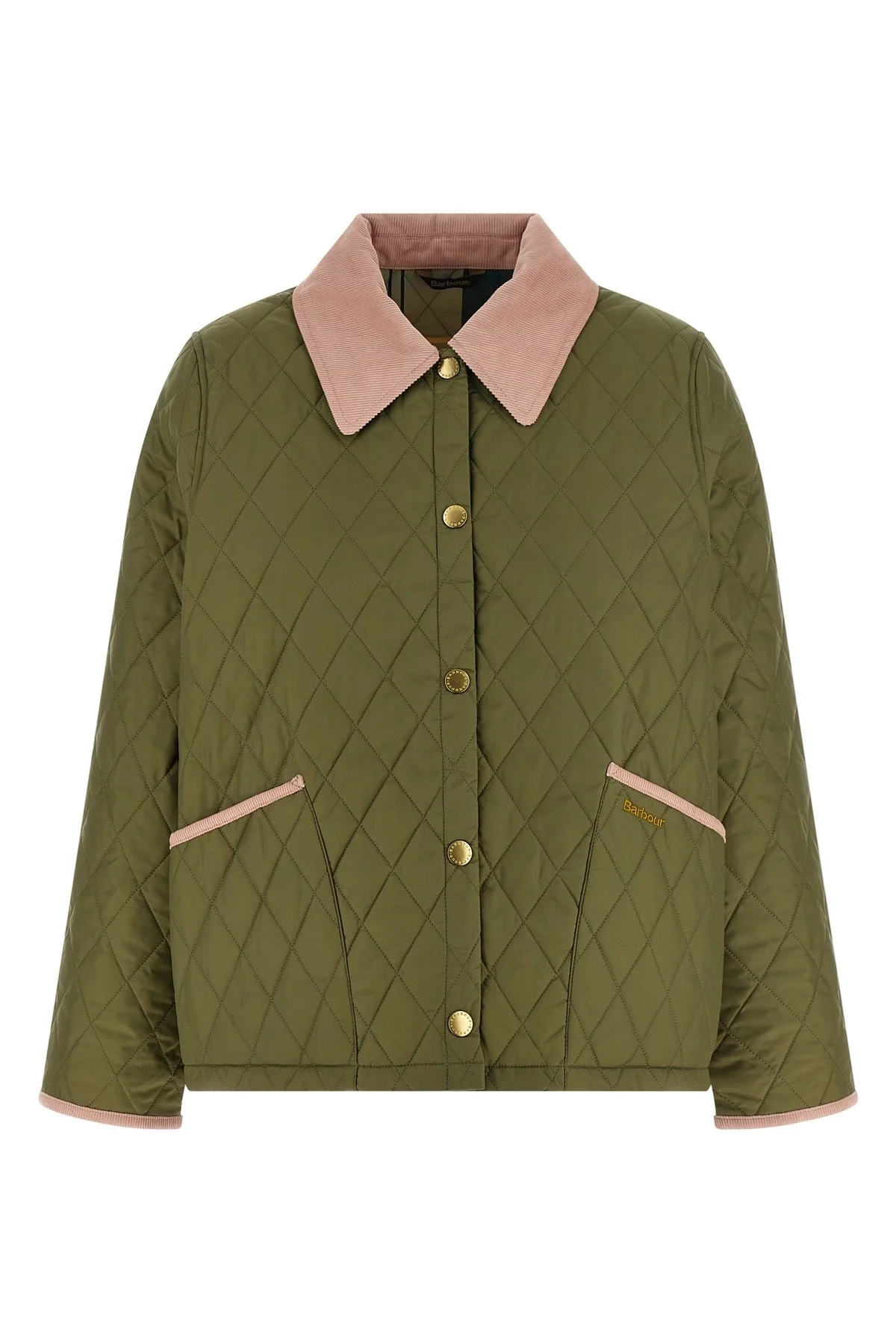 cod. LQU1851LQUGN14 'Liddesdale Cropped Icons' diamond-quilted tech fabric jacket, iconic tartan lining by Barbour, shirt collar and contrast corduroy pockets and cuffs detailing, tone-on-tone logo embroidery and front snap button closure, pockets, long cuffed sleeves. Color: Green Size & Fit: comfort fit - UK sizing Composition: 100% polyamide Made in: Burma