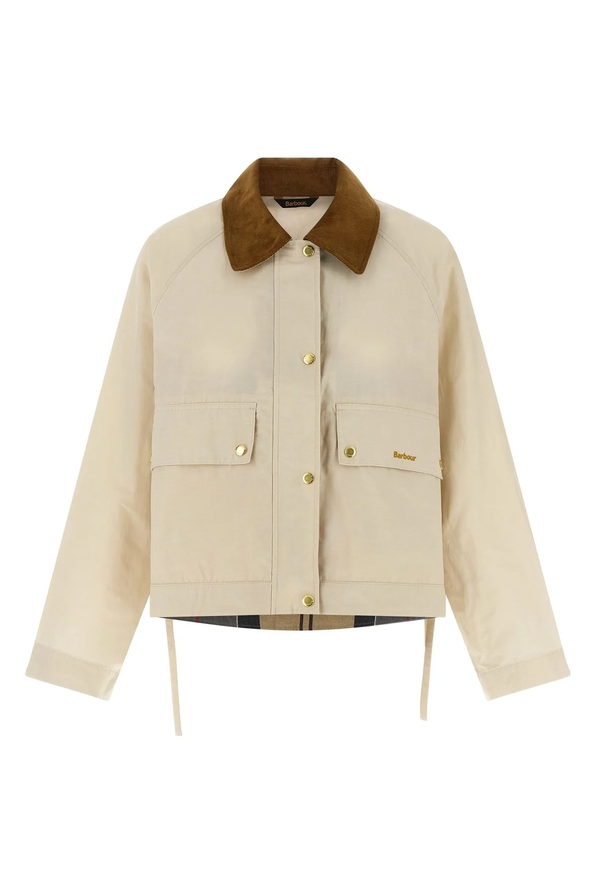 cod. LSP0304LSPCR31 'Medland' waterproof cotton blend rain jacket with tartan lapels, slightly cropped style, contrast velvet shirt collar, logo embroidery and front zip and snap button closure, pockets, adjustable raglan long sleeve with snap button on the cuffs and fold-up, side slits with fabric laces, Asymmetrical hem. Color: Beige Size & Fit: true to size fit - UK sizing Composition: 70% cotton 30% polyamide Made in: Vietnam