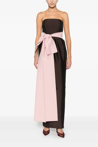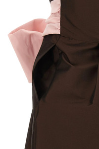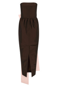 cod. PS26RTWDRESSLIN123 Long 'Lina' taffeta dress, off-the-shoulder model with structured bustier, contrasting maxi bow on the front, back curled waist, sleeveless, pockets, slit and back zip closure. Color: Brown Size & Fit: FRENCH size Fits rather small around bust and waist. Size up if you're in between two sizes. Composition: 78% polyester 20% polyamide 2% elastane Made in: Romania