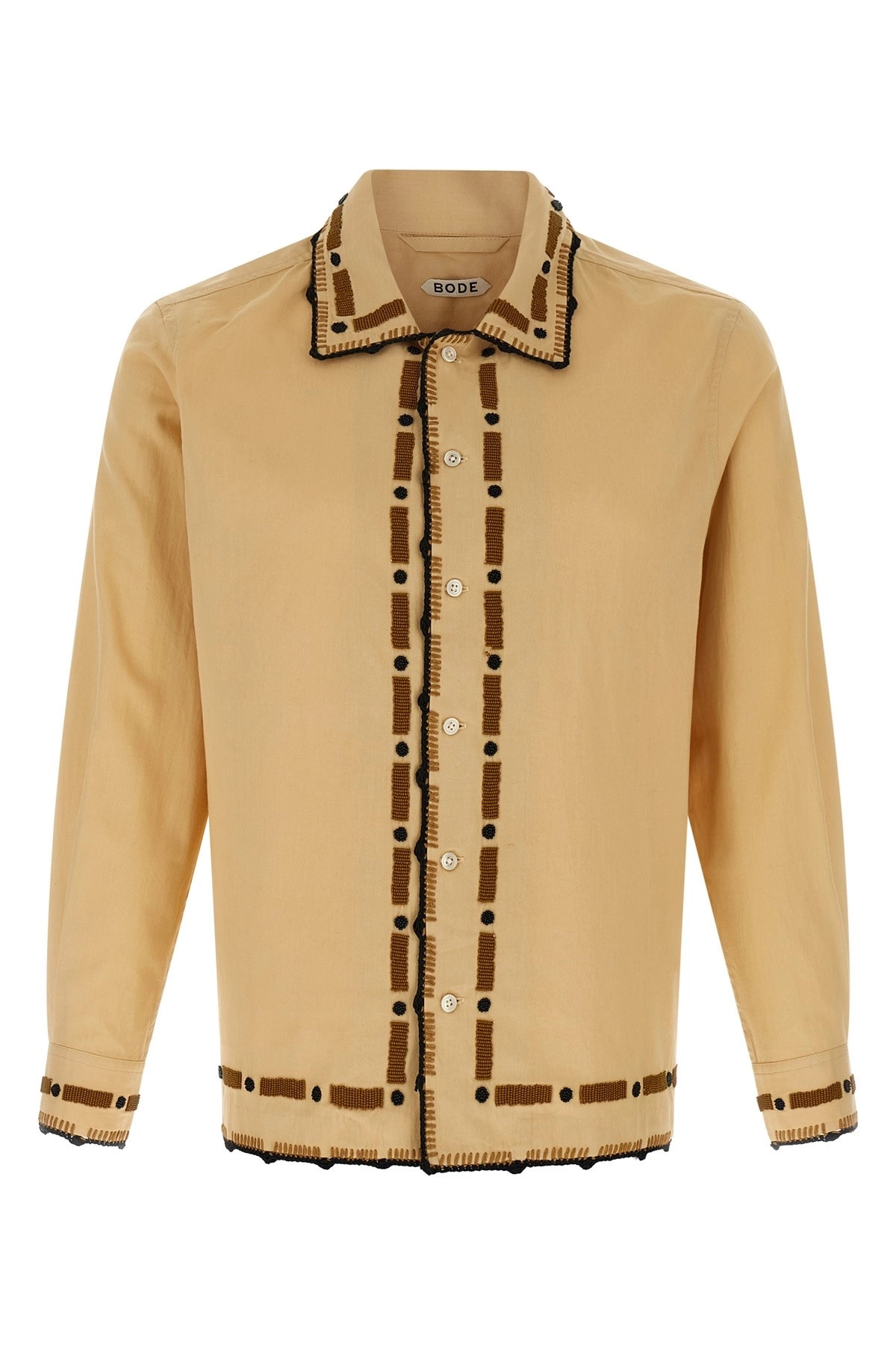 cod. MRF25SH019TANBROWN 'Beaded Ryegrass' cotton shirt with embroideries and handmade beads, front button closure, long cuffed sleeves. Color: Beige Size & Fit: true to size fit Composition: 100% cotton Made in: India